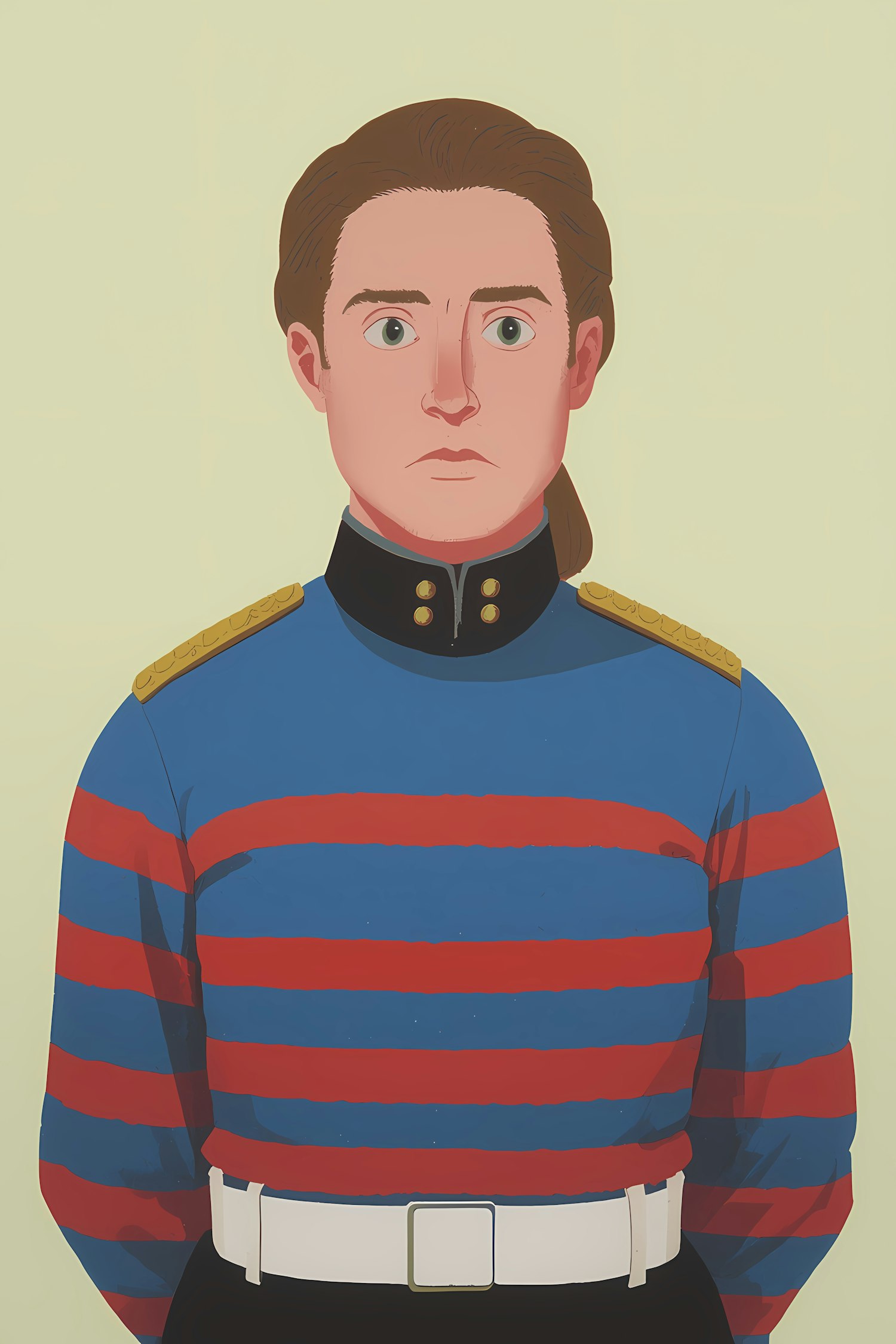 Illustration of a person in a blue and red striped uniform with gold epaulets, set against a plain yellow background.