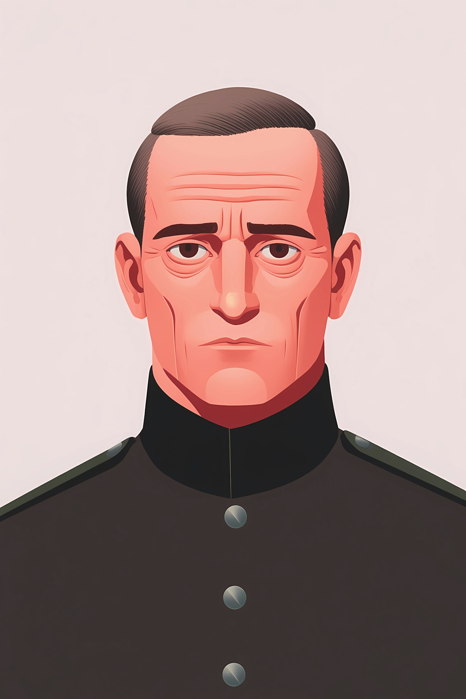 Stylized illustration of a man in a formal uniform with a serious expression, set against a plain background.