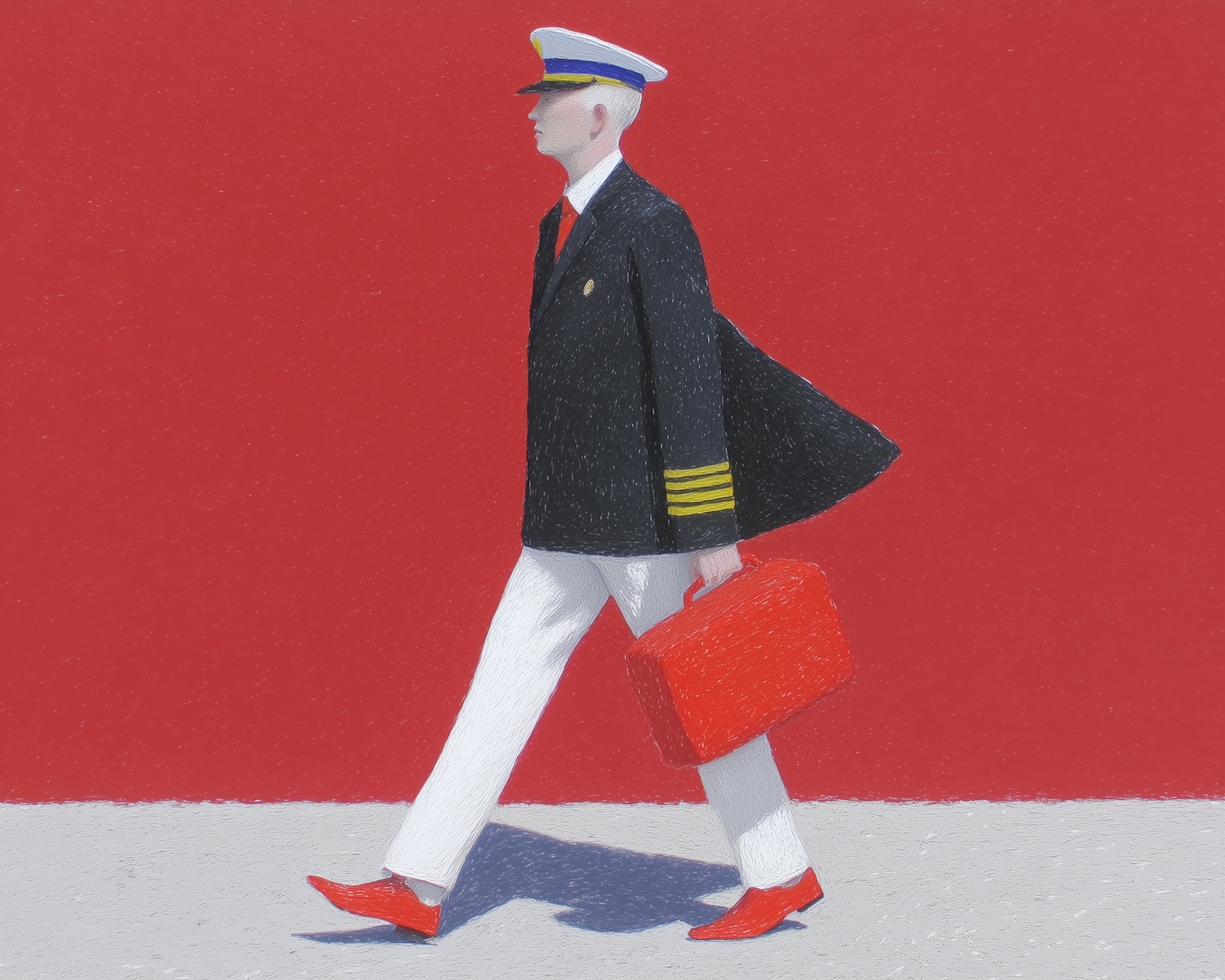 Stylized illustration of a uniformed figure walking with a red briefcase against a bold red background, emphasizing color and motion.