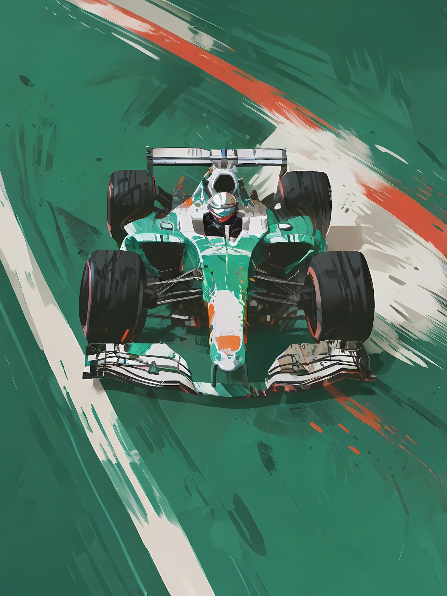 Vivid illustration of a green, white, and orange Formula 1 car racing on a stylized track, showcasing speed and dynamic motion.