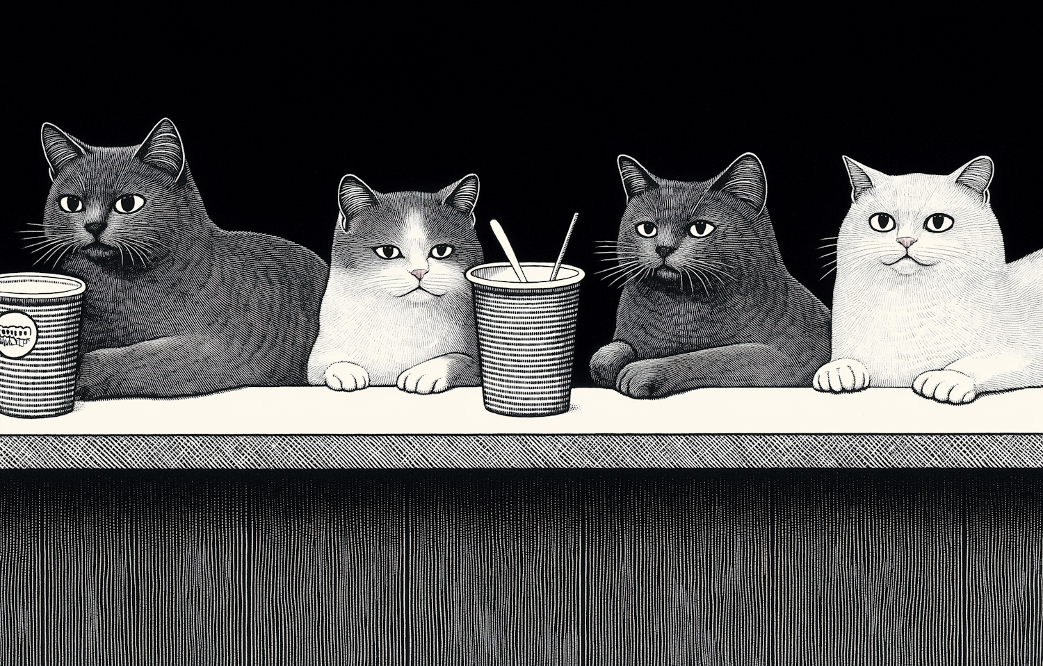 Four cats sit at a counter with striped cups, each displaying unique expressions against a black background.