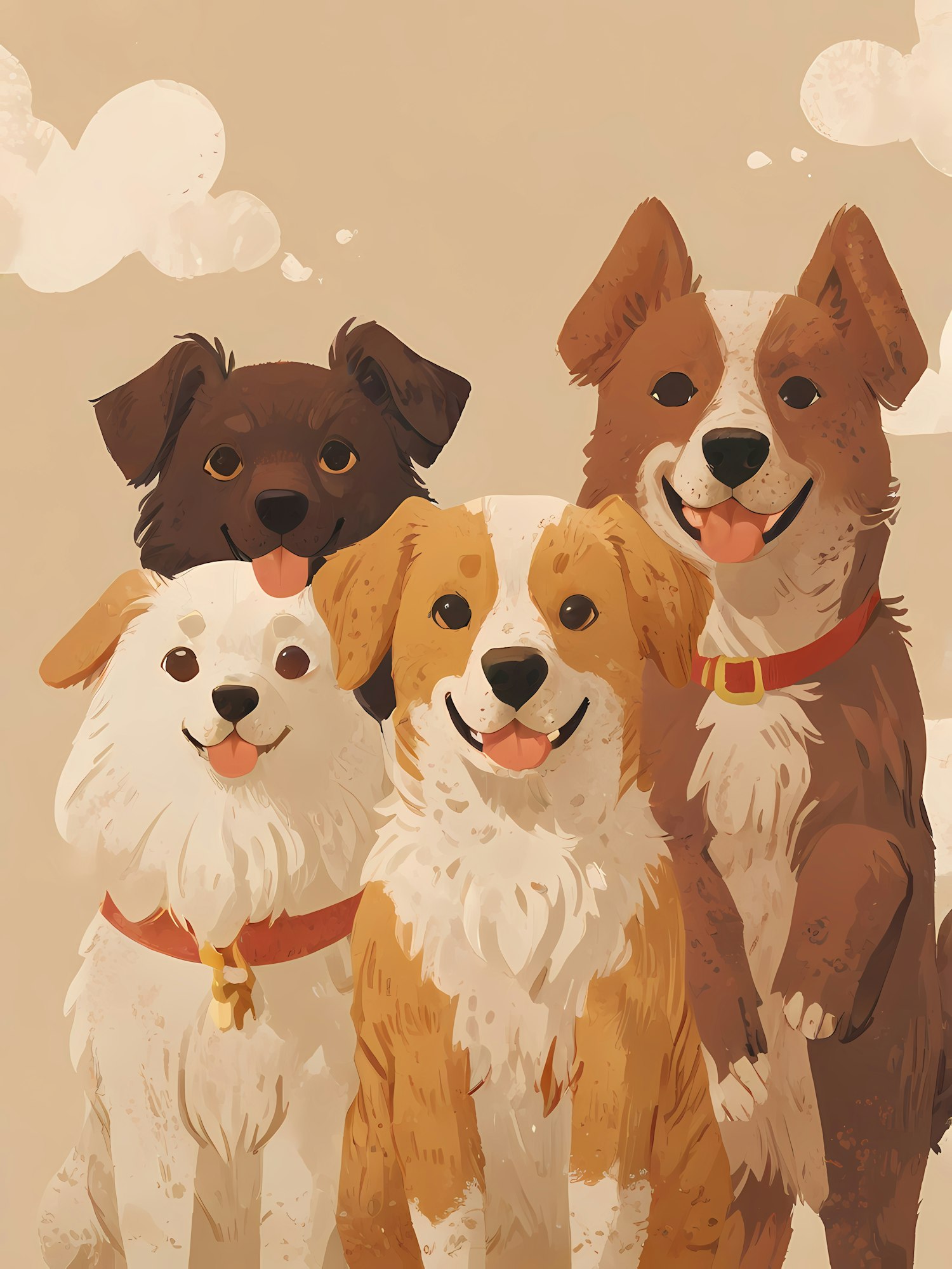 Charming illustration of four cartoon dogs with diverse fur colors and happy expressions against a soft beige background.