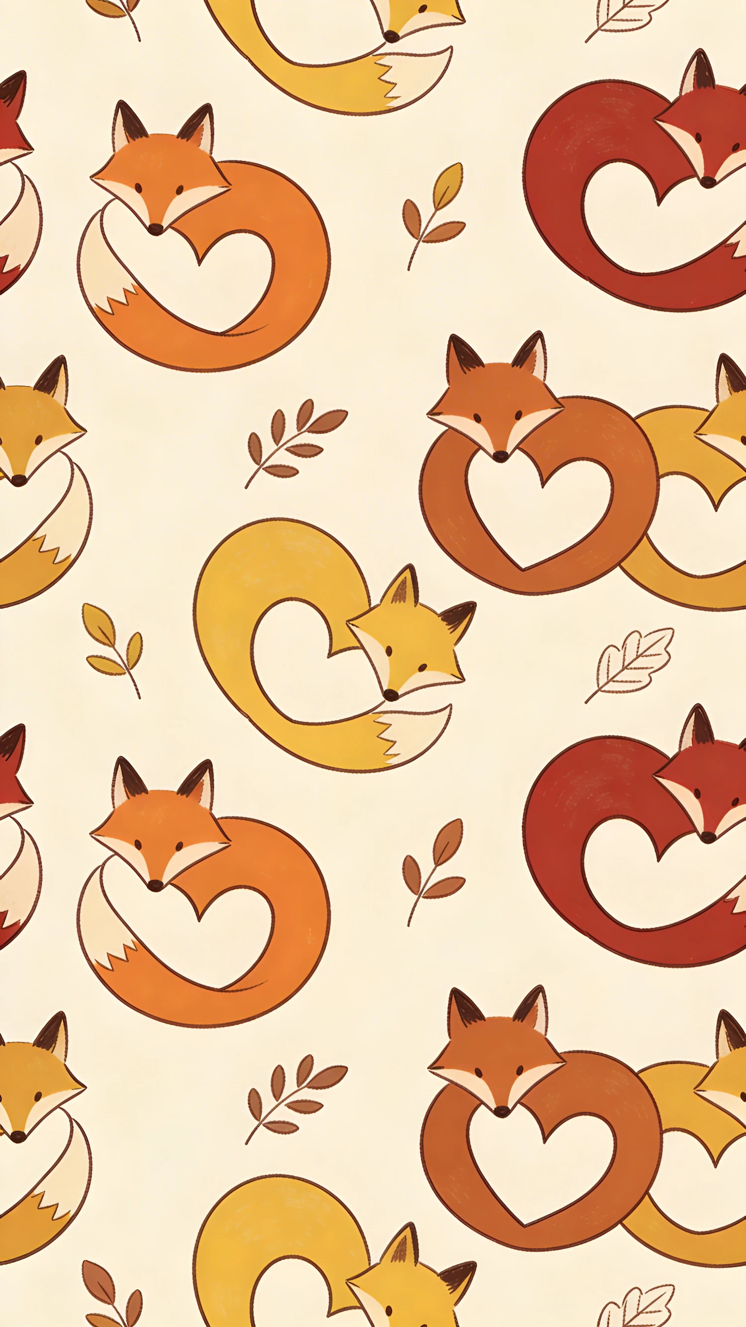 Repeating pattern: foxes curled into heart shapes, warm autumn palette.
