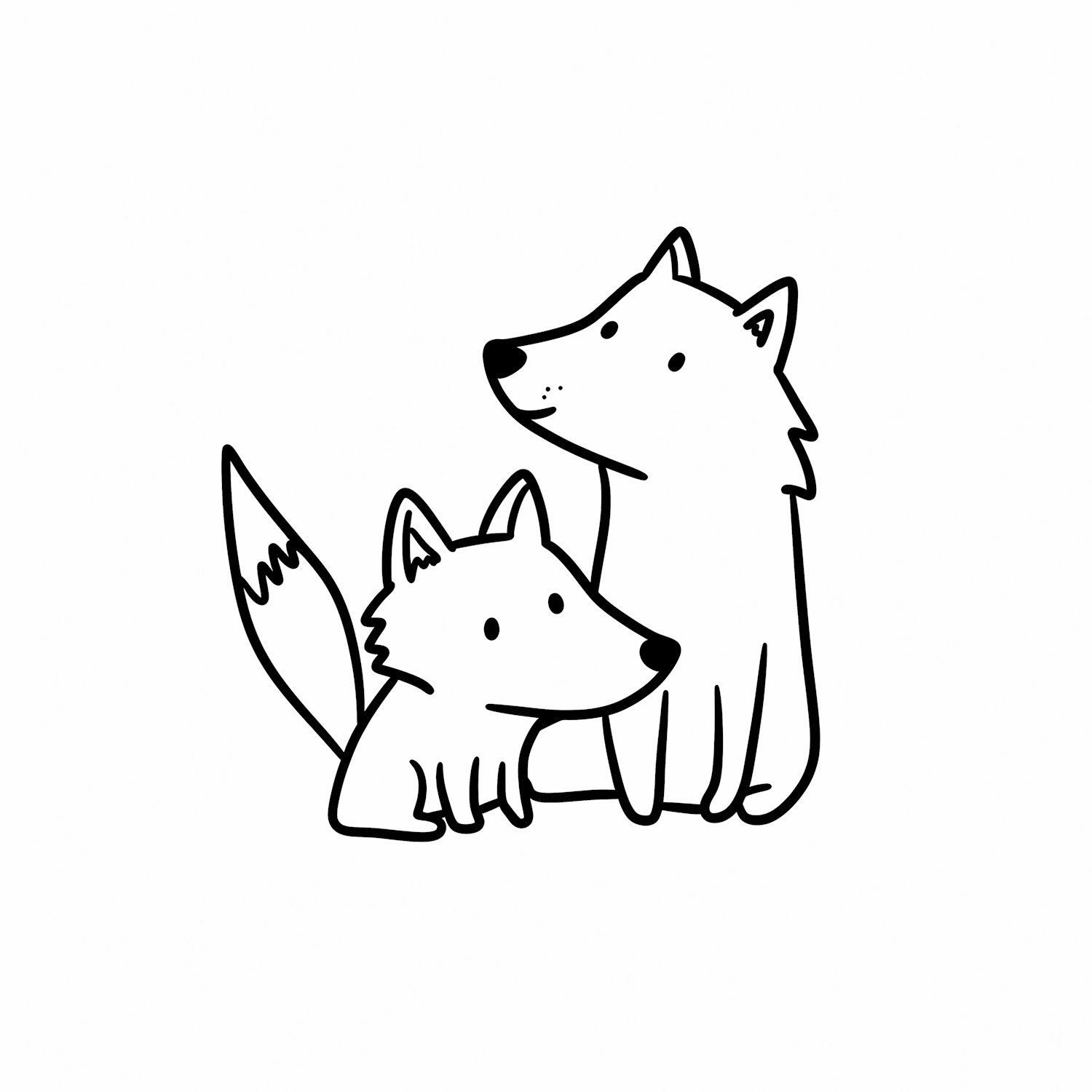 Minimalistic black-and-white illustration of two cartoon foxes, one larger and one smaller, sitting together in a protective pose.
