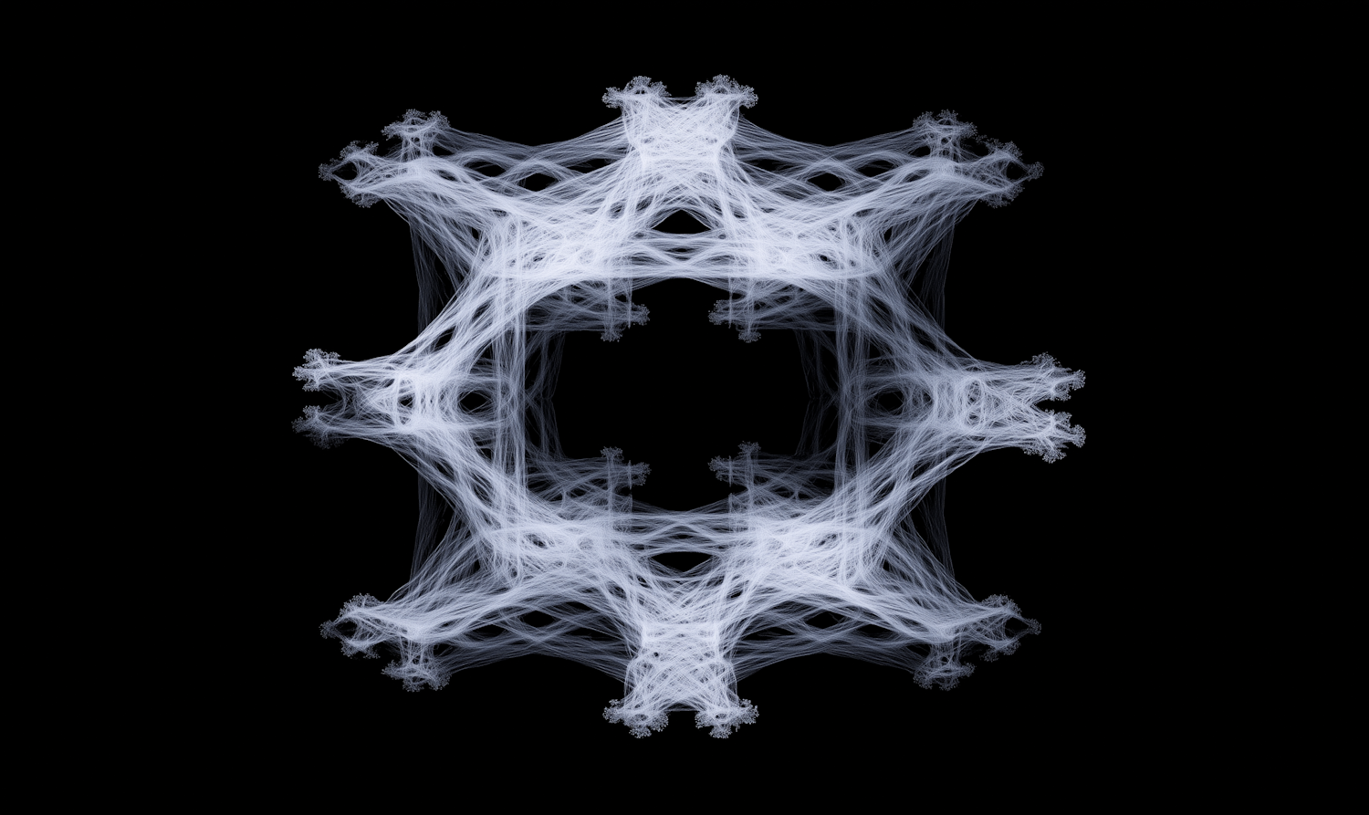 Intricate white fractal design resembling a snowflake or web, set against a black background, showcasing geometric and ethereal beauty.