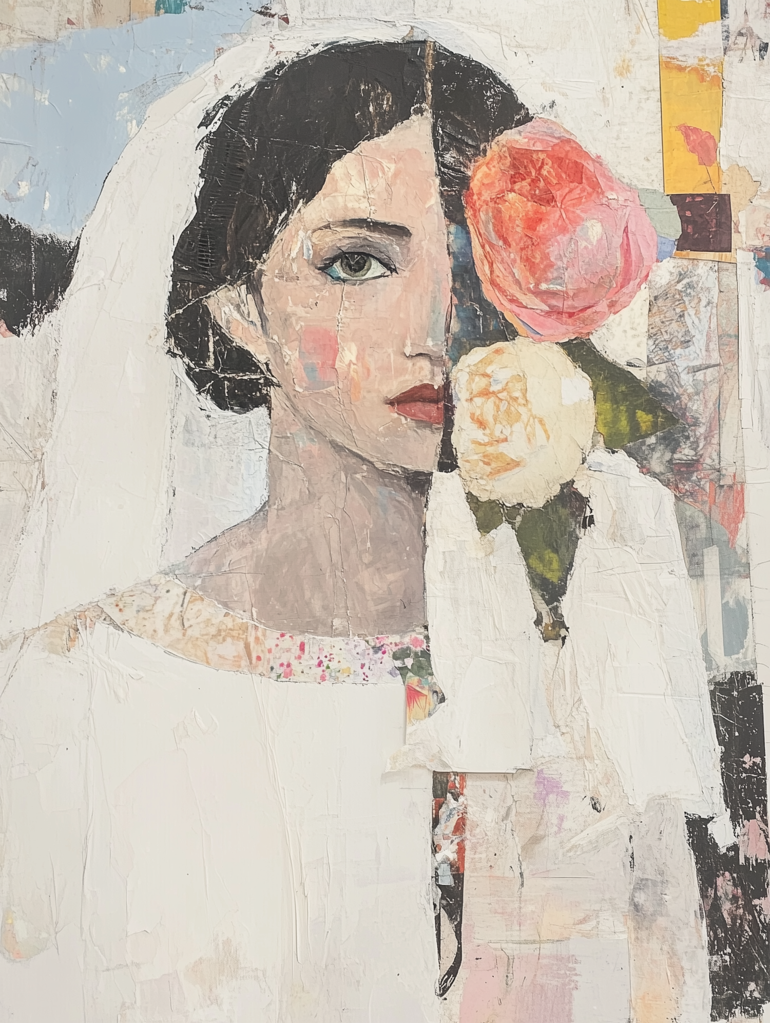 A mixed-media artwork depicting a bride with flowers and abstract textures, blending realism and abstraction in a unique composition.