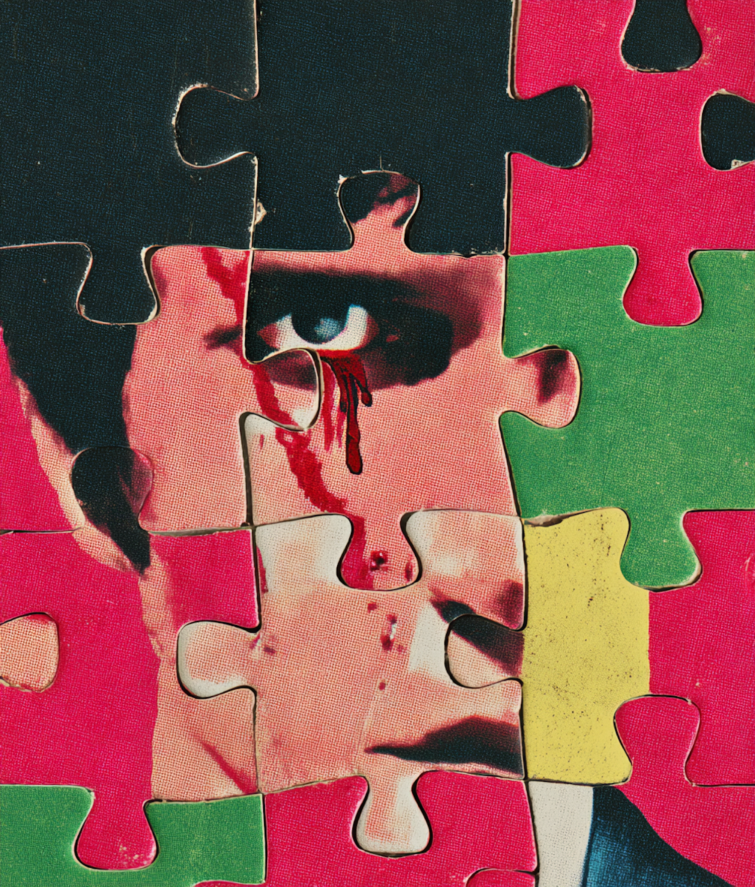 Assembled puzzle depicting a fragmented human face with intense contrasting colors, abstract details creating an artistic emotional expression.