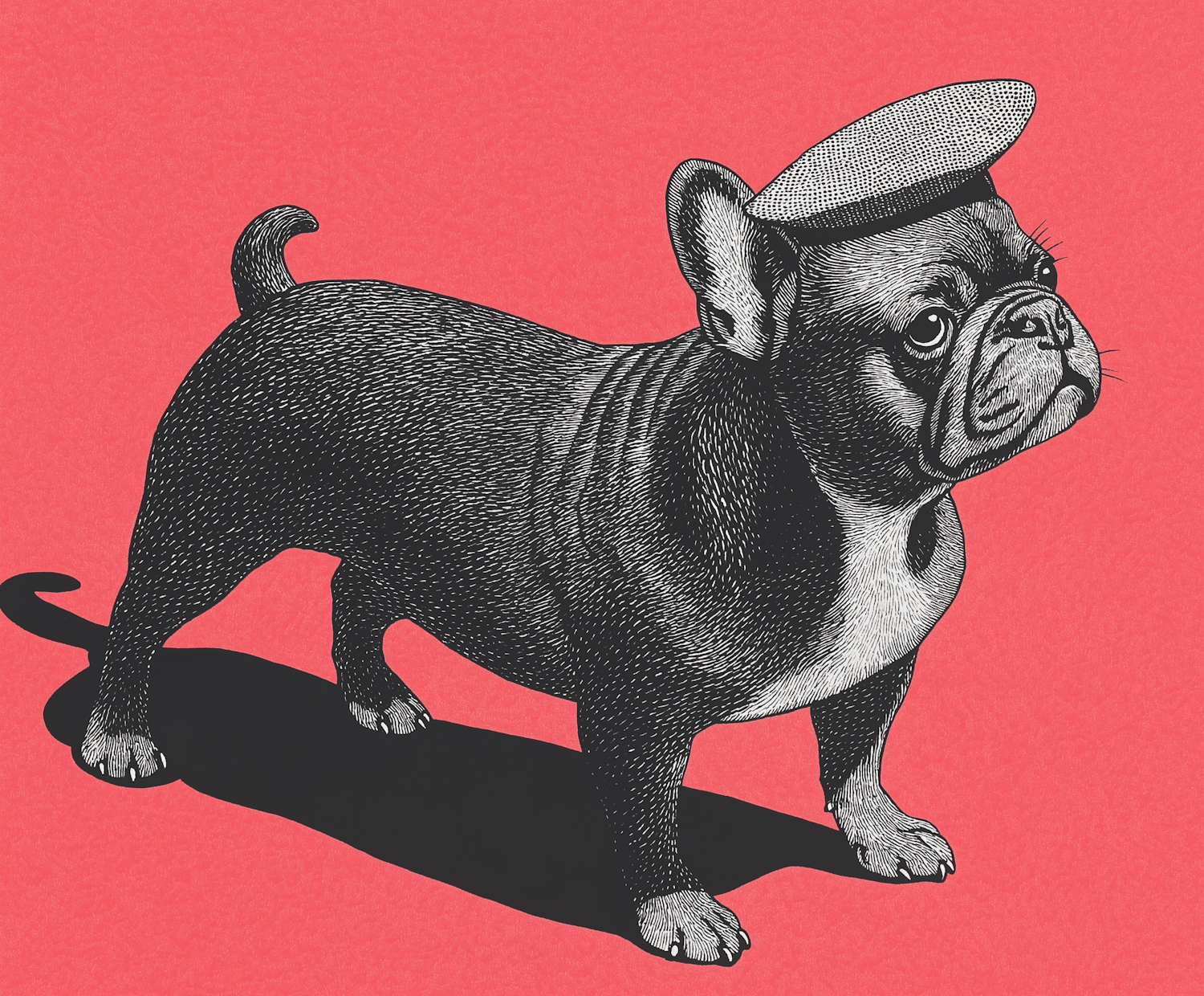 Stylized French Bulldog illustration with a beret on a red background, showcasing intricate fur texture and a playful expression.