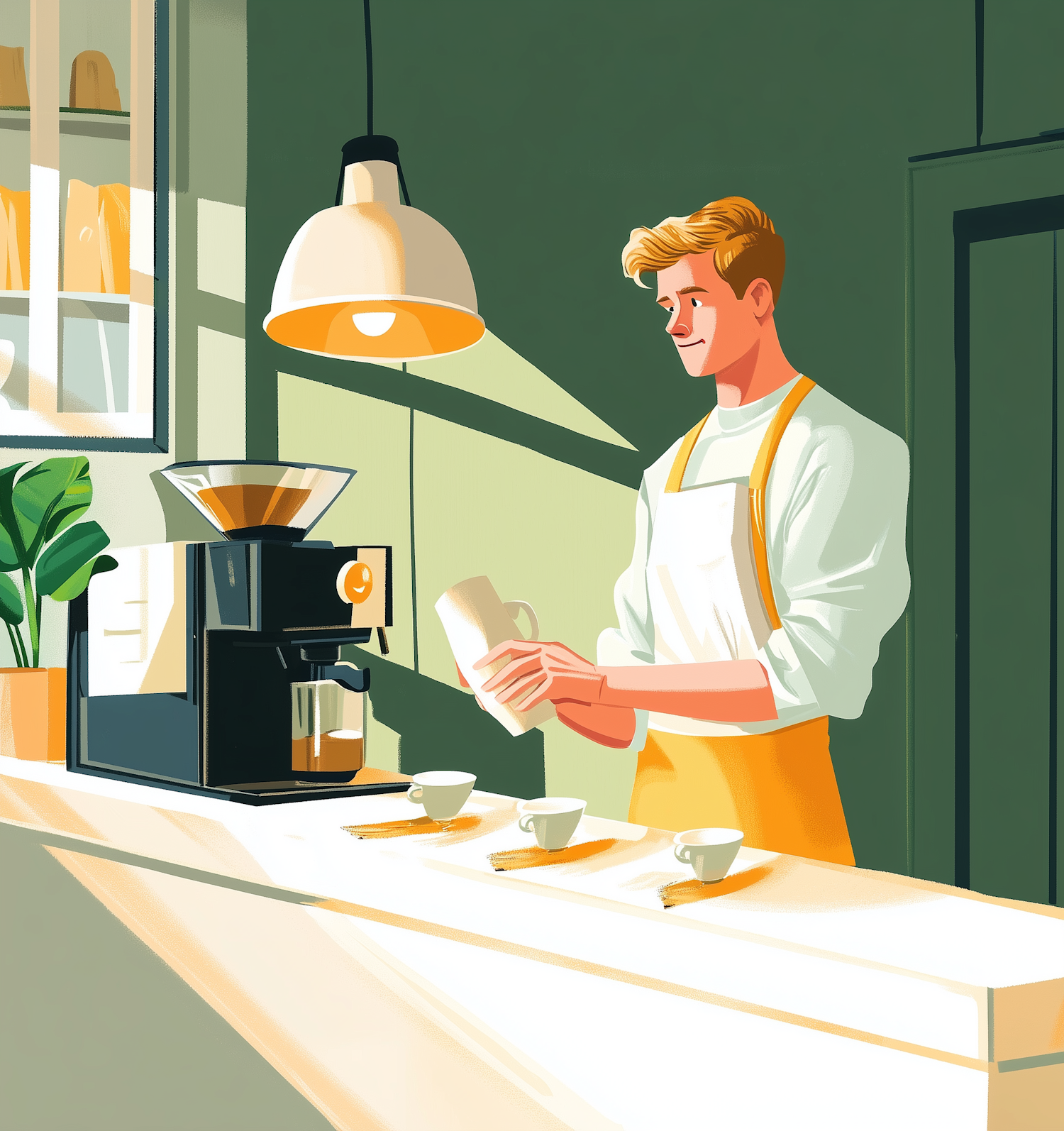 A cheerful barista in a yellow apron prepares coffee in a bright kitchen with a modern coffee machine and stylish decor.
