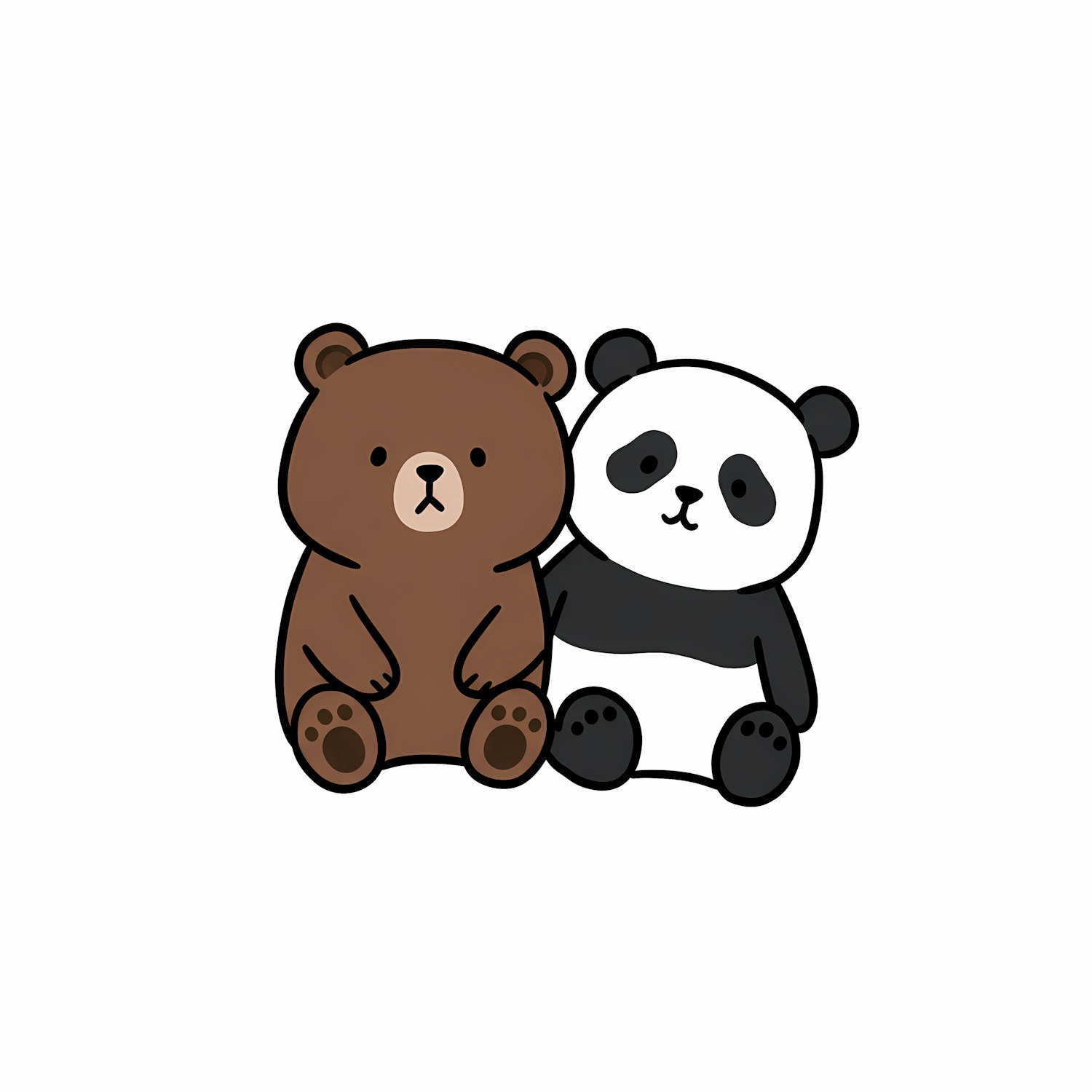 Adorable cartoon bears, a brown bear and a panda, sitting together with a friendly gesture on a clean white background.