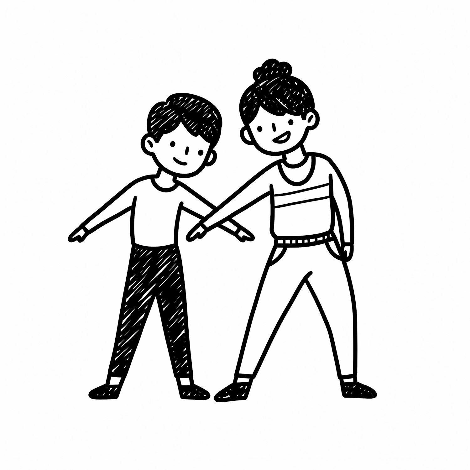 A charming black-and-white cartoon illustration of two smiling characters standing together, drawn in a simple and friendly style.