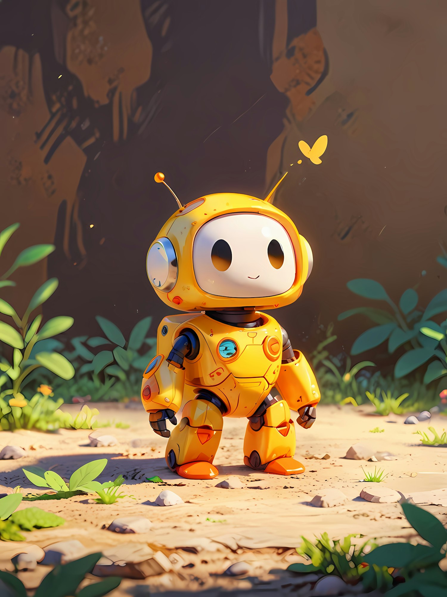 Adorable yellow robot with big eyes and a butterfly companion in a sunny, nature-filled setting. Perfect mix of tech and whimsy!