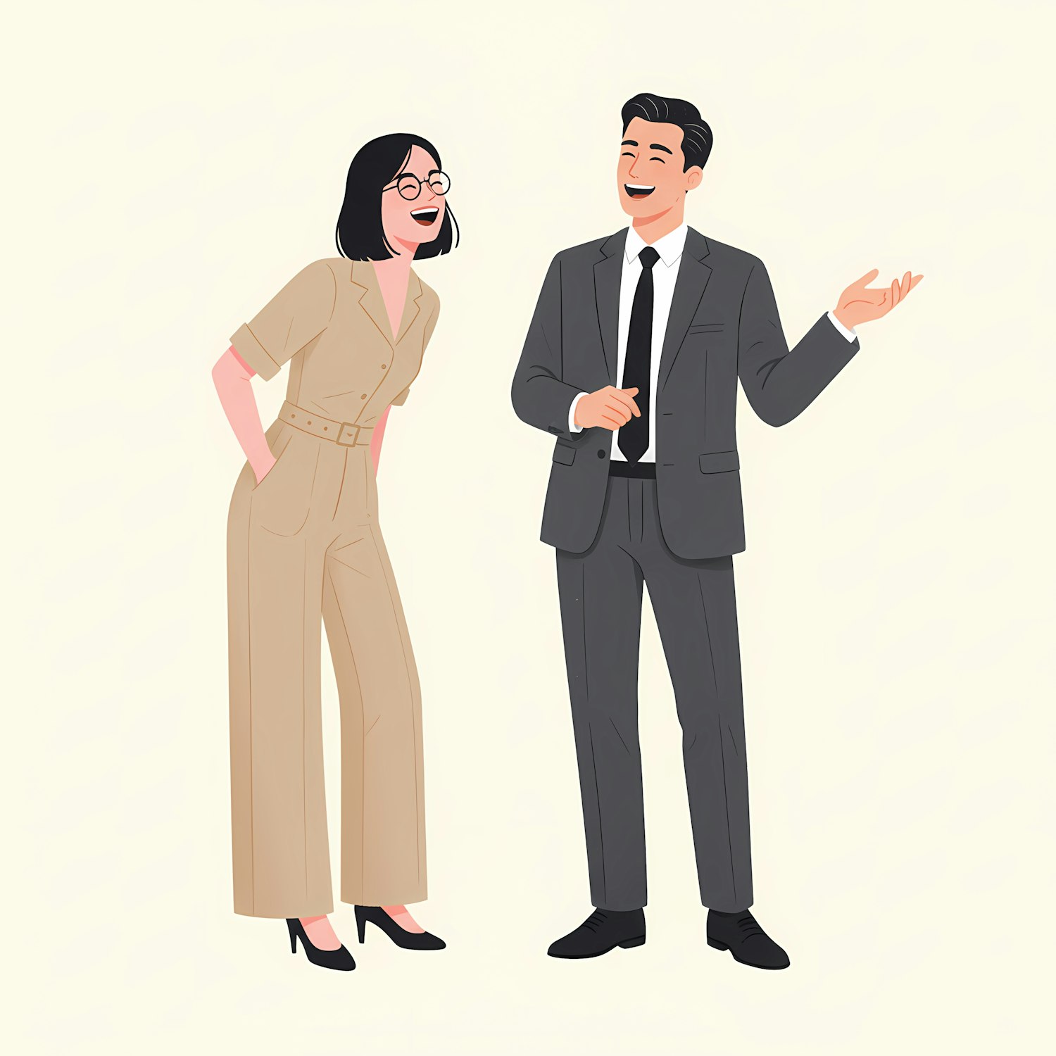 Illustration of a man in a suit and a woman in a beige jumpsuit laughing together, conveying a cheerful and friendly interaction.