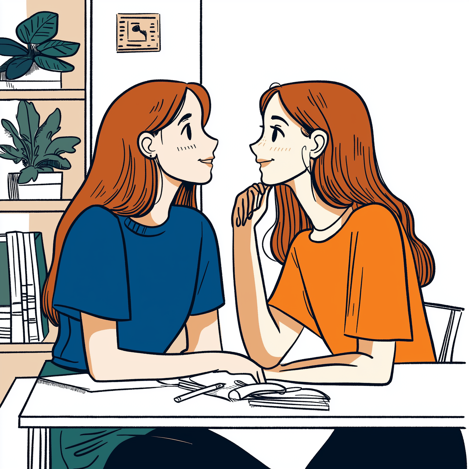 Two red-haired women in blue and orange shirts share a friendly conversation at a table with a notebook and pen, surrounded by books and plants.
