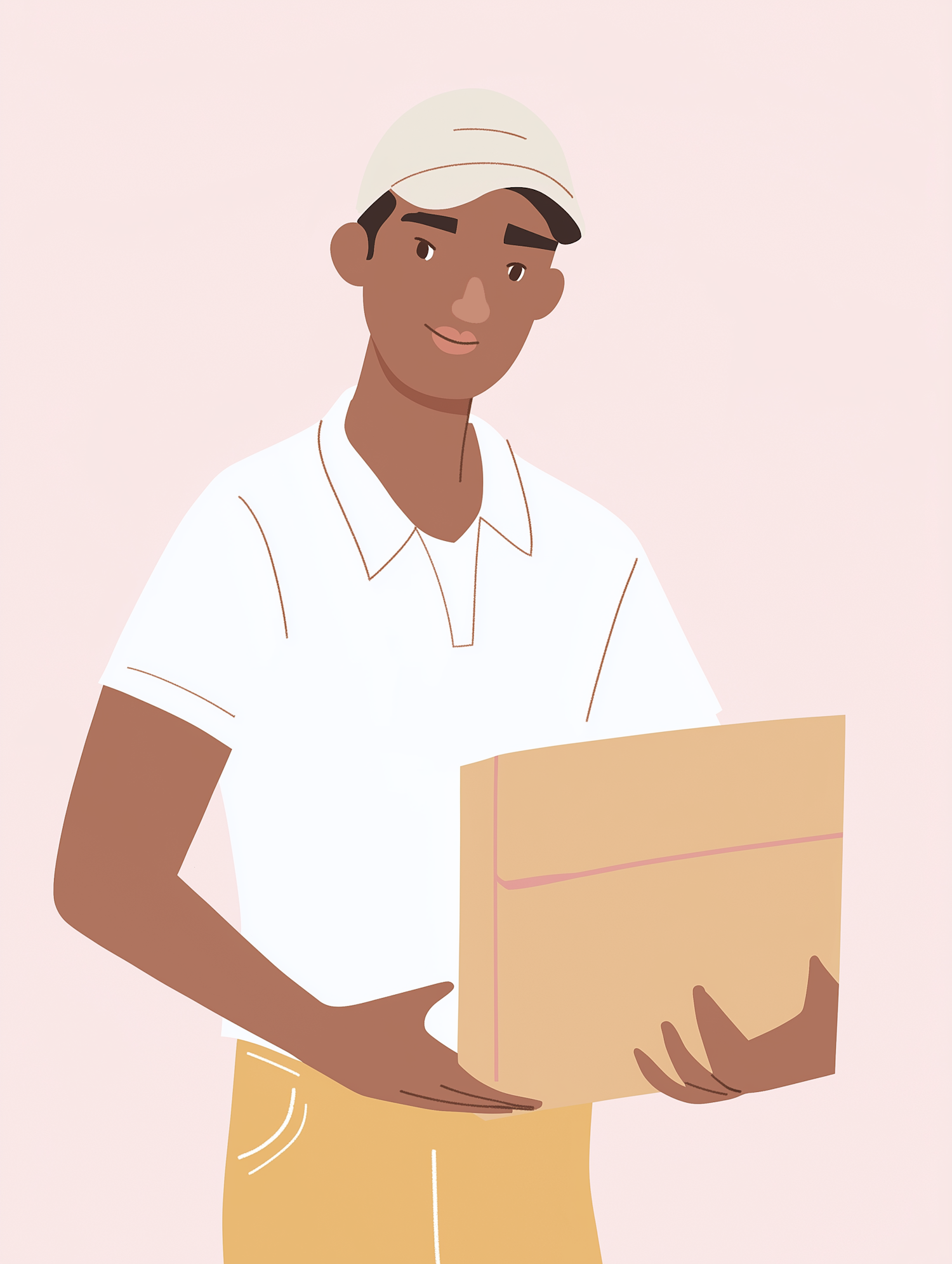 Illustration of a delivery person with a package, wearing a beige cap and white shirt, set against a pastel pink background.