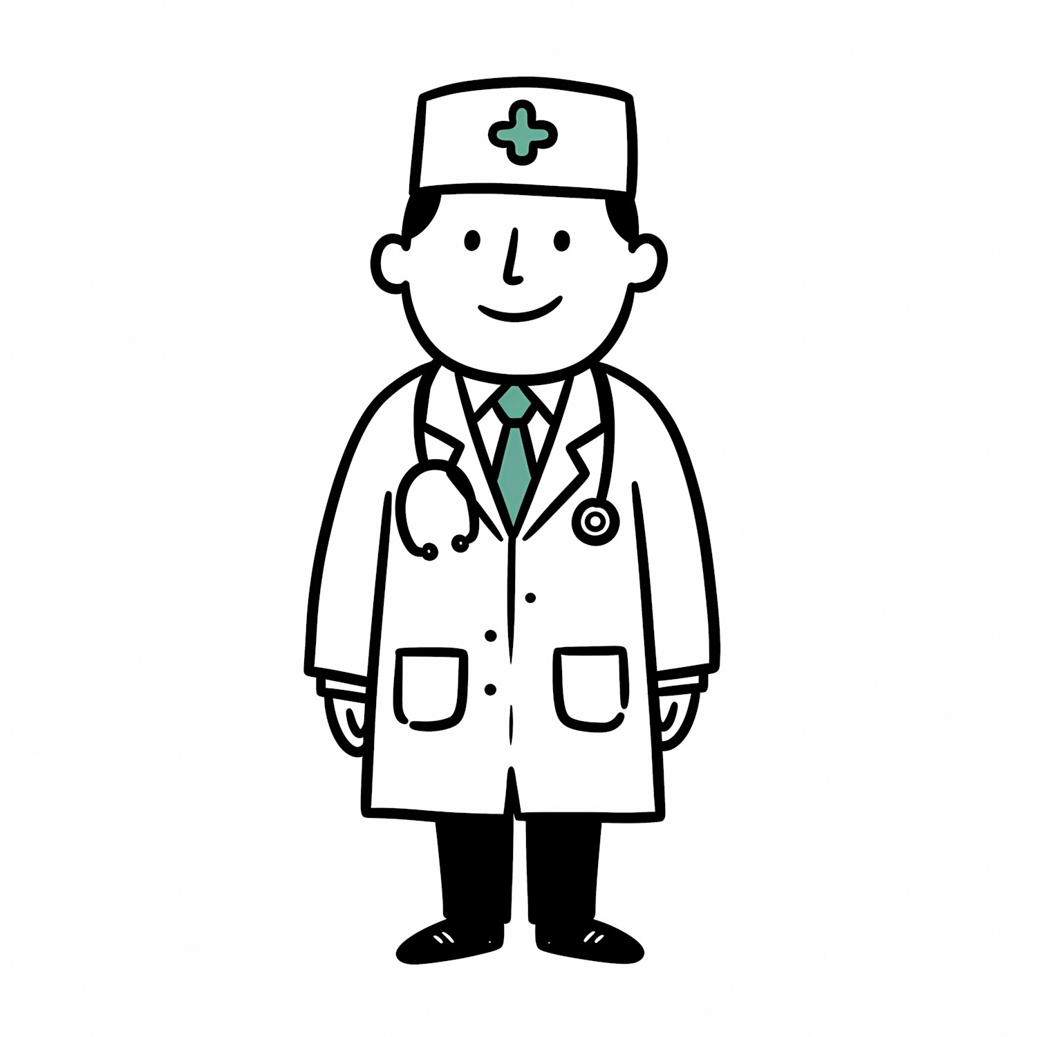 Cartoon illustration of a friendly doctor in a white coat with a stethoscope, green tie, and a medical hat with a green cross.