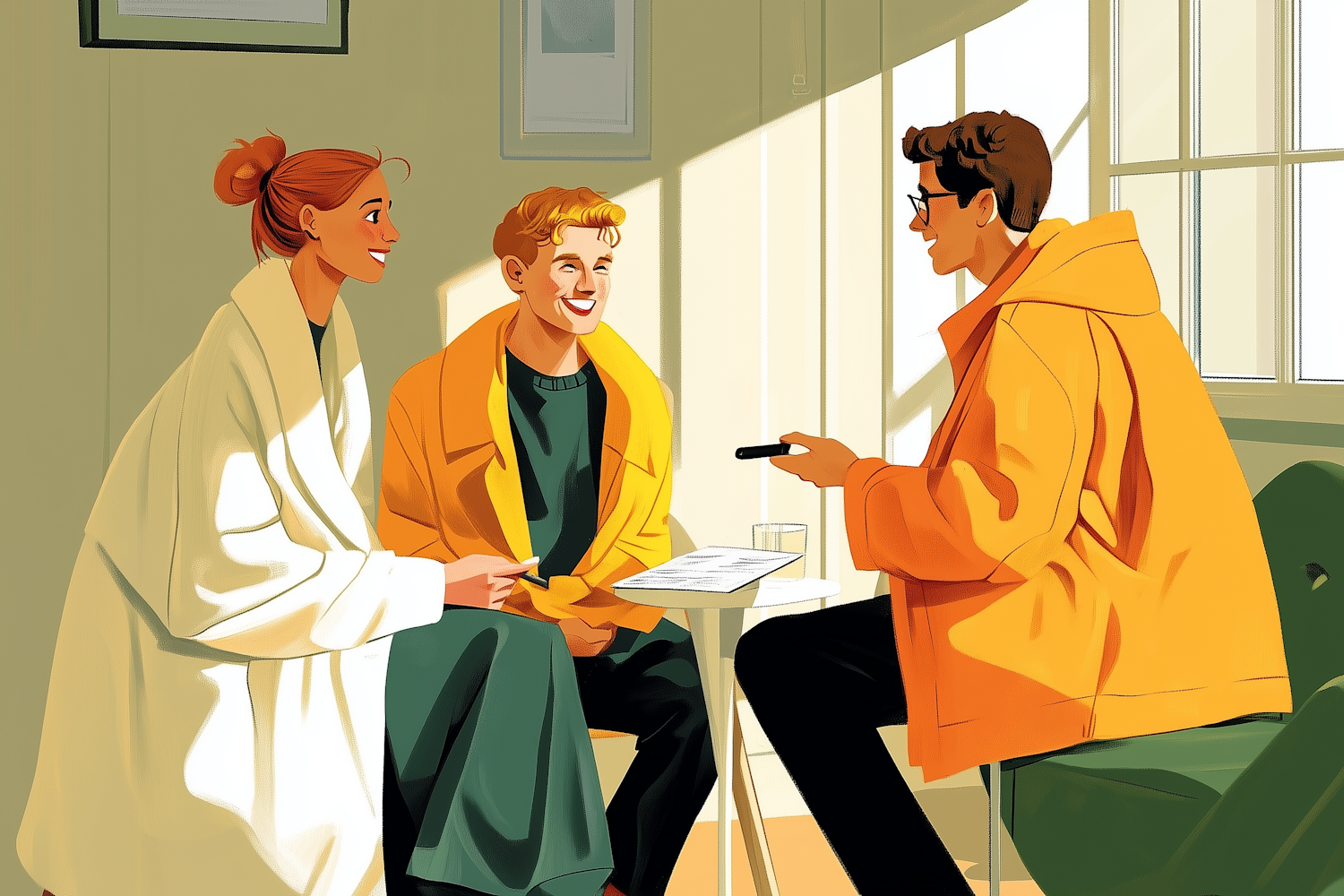 Three people in a cozy room, engaged in conversation. Bright coats, warm lighting, and a friendly atmosphere highlight the scene.