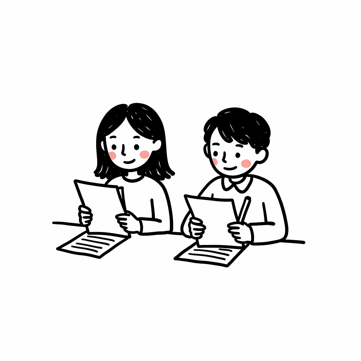 Minimalistic illustration of two people reading papers, drawn in black and white with red accents, conveying a cheerful and focused mood.