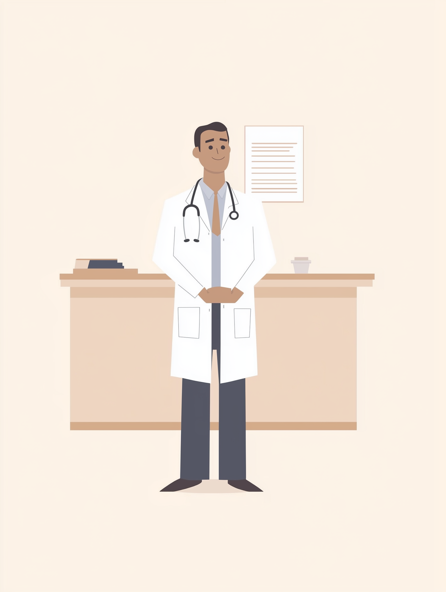 Illustration of a male doctor with a stethoscope, standing in front of a desk, exuding professionalism and friendliness.