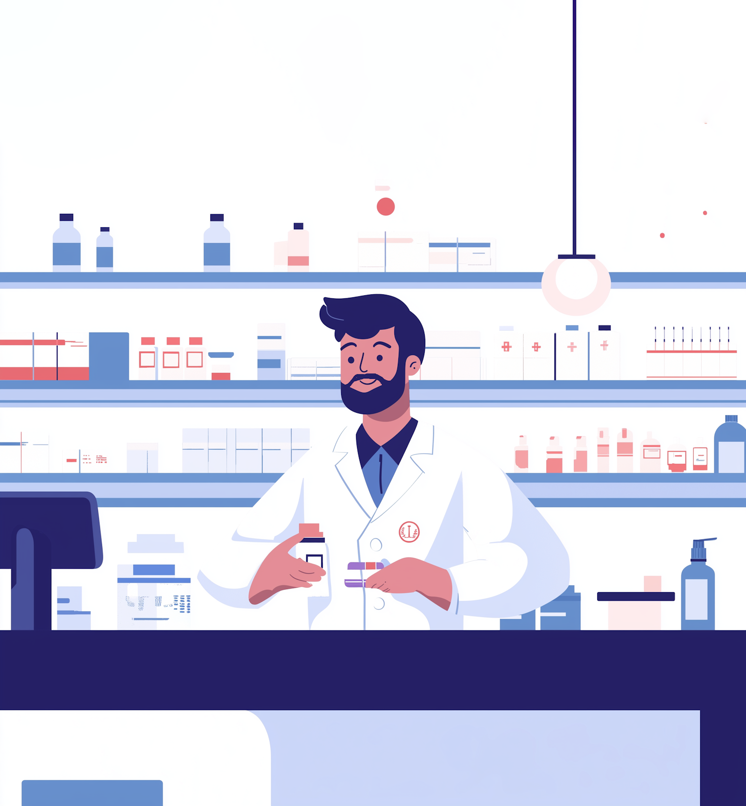 Cartoon pharmacist in a white coat holding medicine, surrounded by shelves of bottles and boxes in a clean, organized pharmacy.