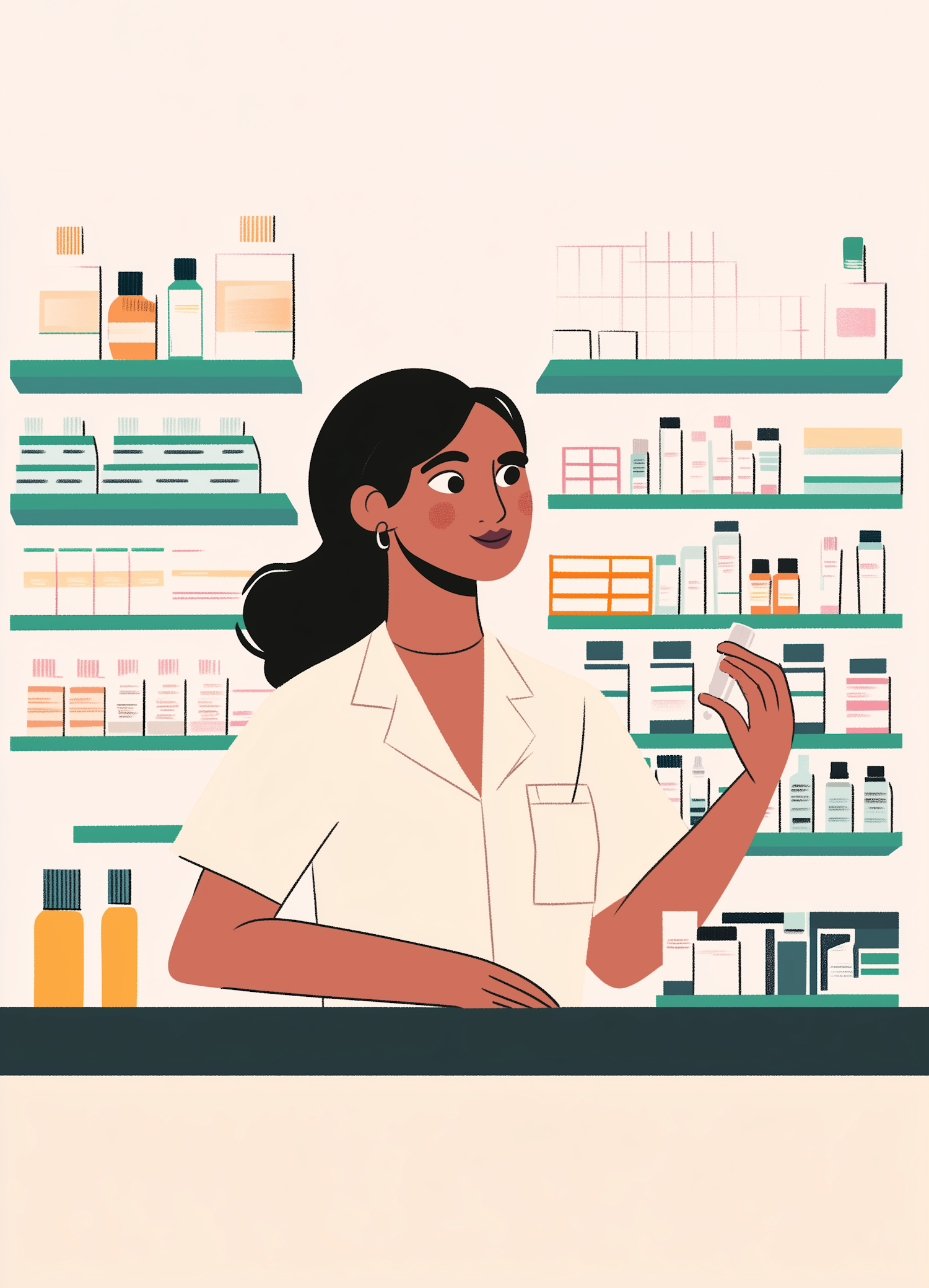 Illustration of a female pharmacist in a pharmacy, examining a bottle with shelves of products behind her.