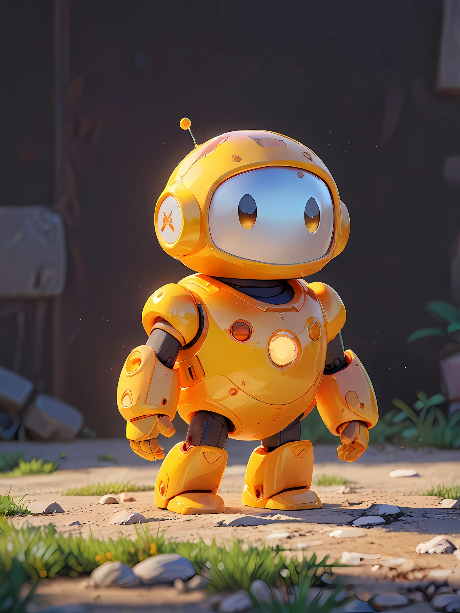 Adorable yellow robot with glowing accents stands in a sunny outdoor setting, surrounded by grass and rocks.