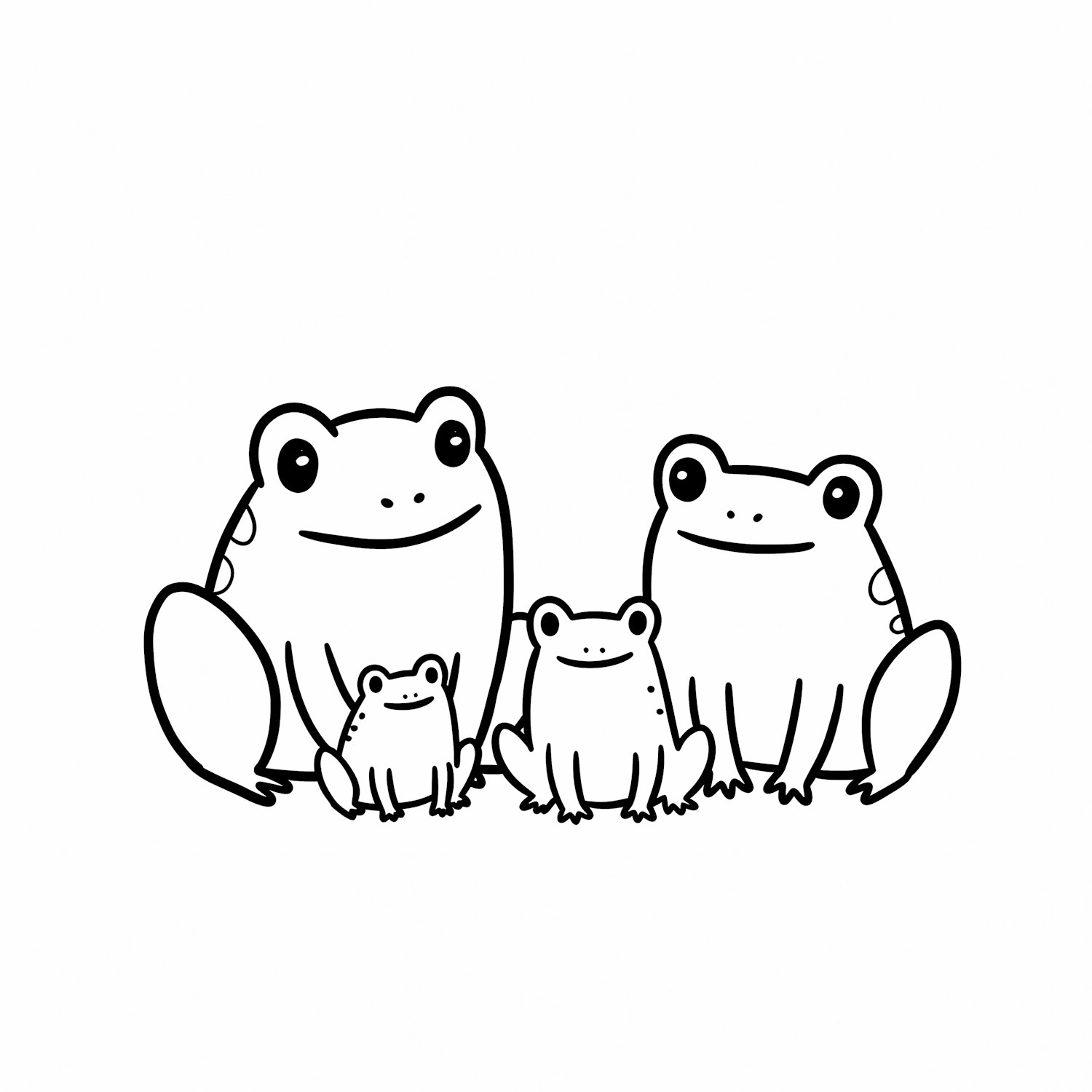 A cute black-and-white illustration of a frog family, featuring two large and two small frogs sitting together in a simple, cartoonish style.