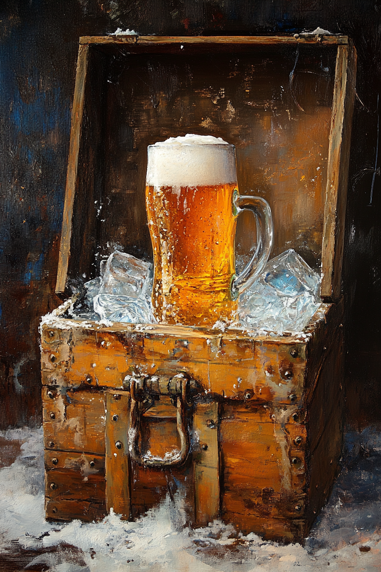 A frothy mug of amber beer sits on ice in an open wooden chest, surrounded by snow, creating a rustic and refreshing scene.