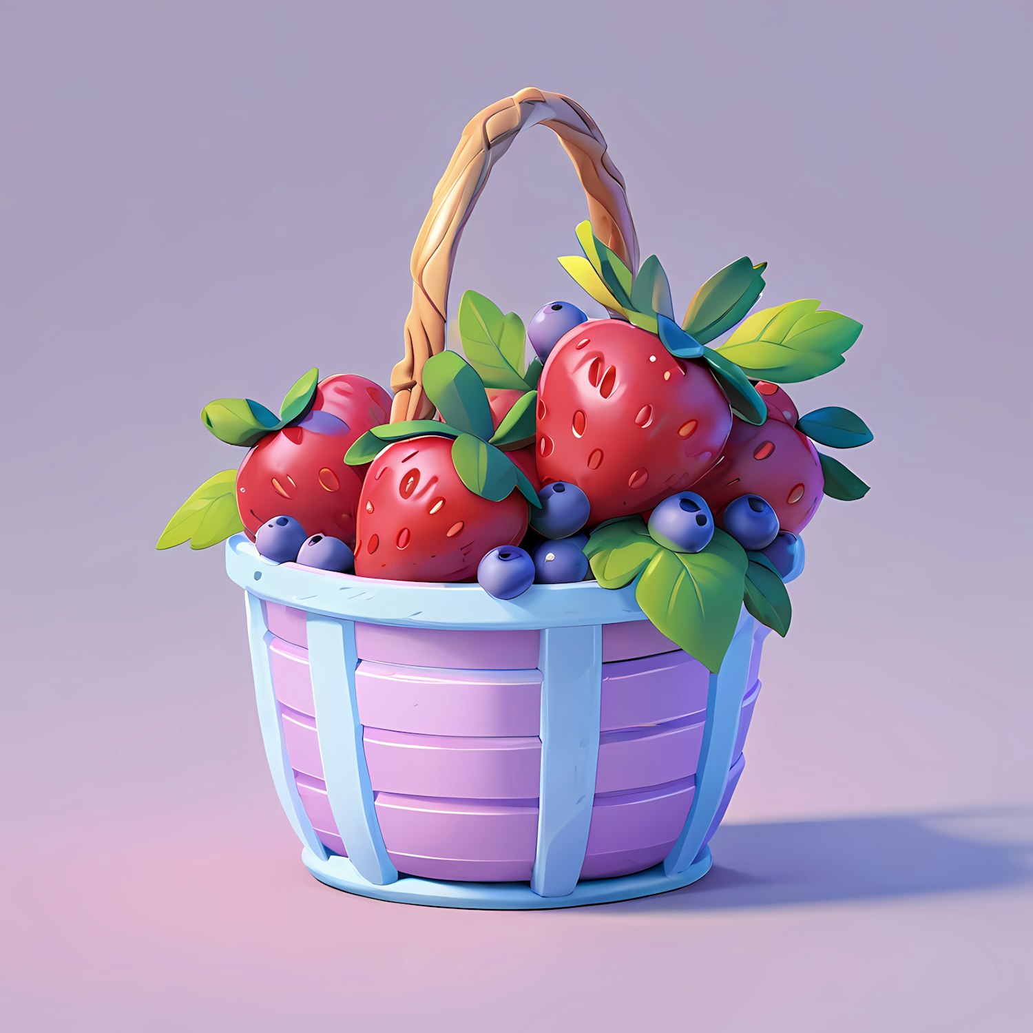Whimsical illustration of a pastel basket filled with vibrant strawberries and blueberries against a soft purple background.