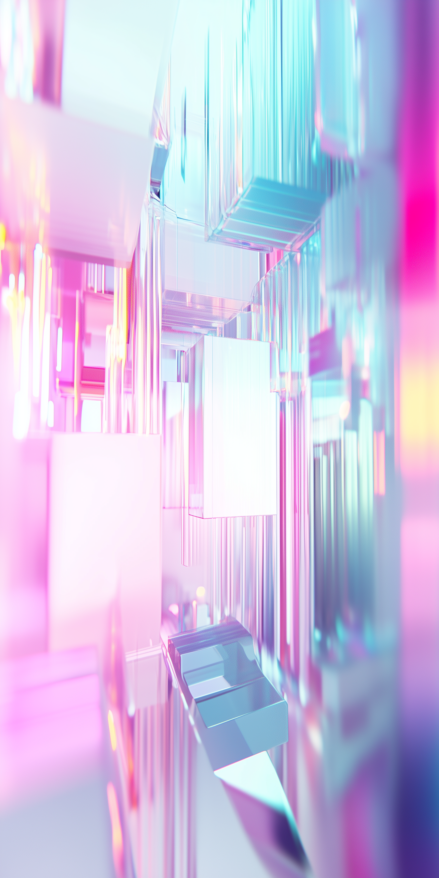 Abstract 3D art with glowing pastel prisms and geometric shapes in pink, blue, and purple hues, creating a futuristic crystalline vibe.