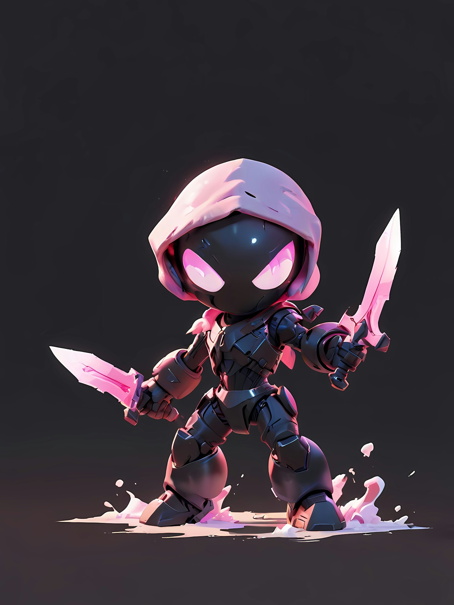 A futuristic 3D robotic character with a pink hood and glowing energy blades, standing dynamically on a dark background.