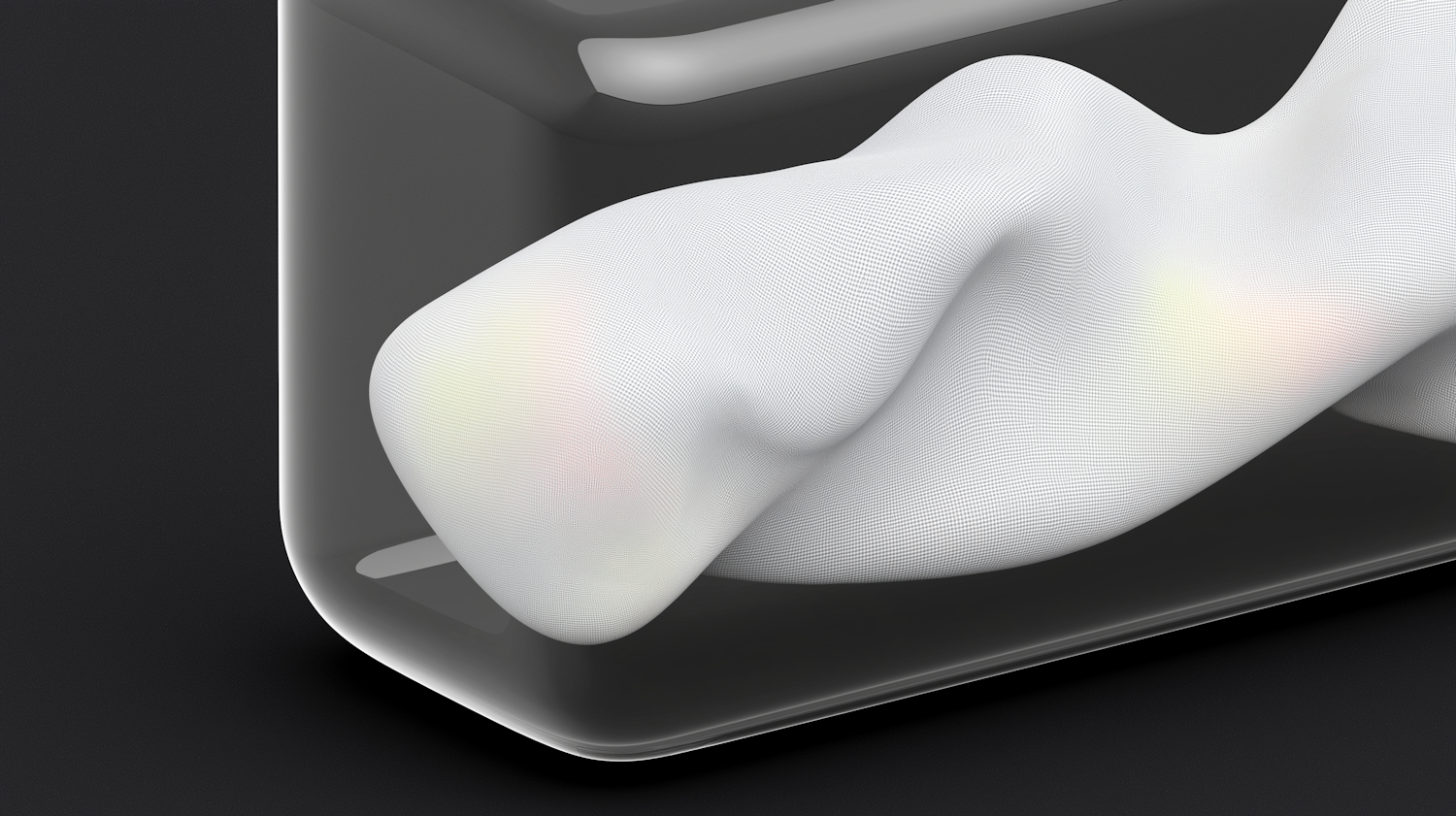 A futuristic 3D design with a flowing white mesh structure inside a transparent container, set against a sleek black background.