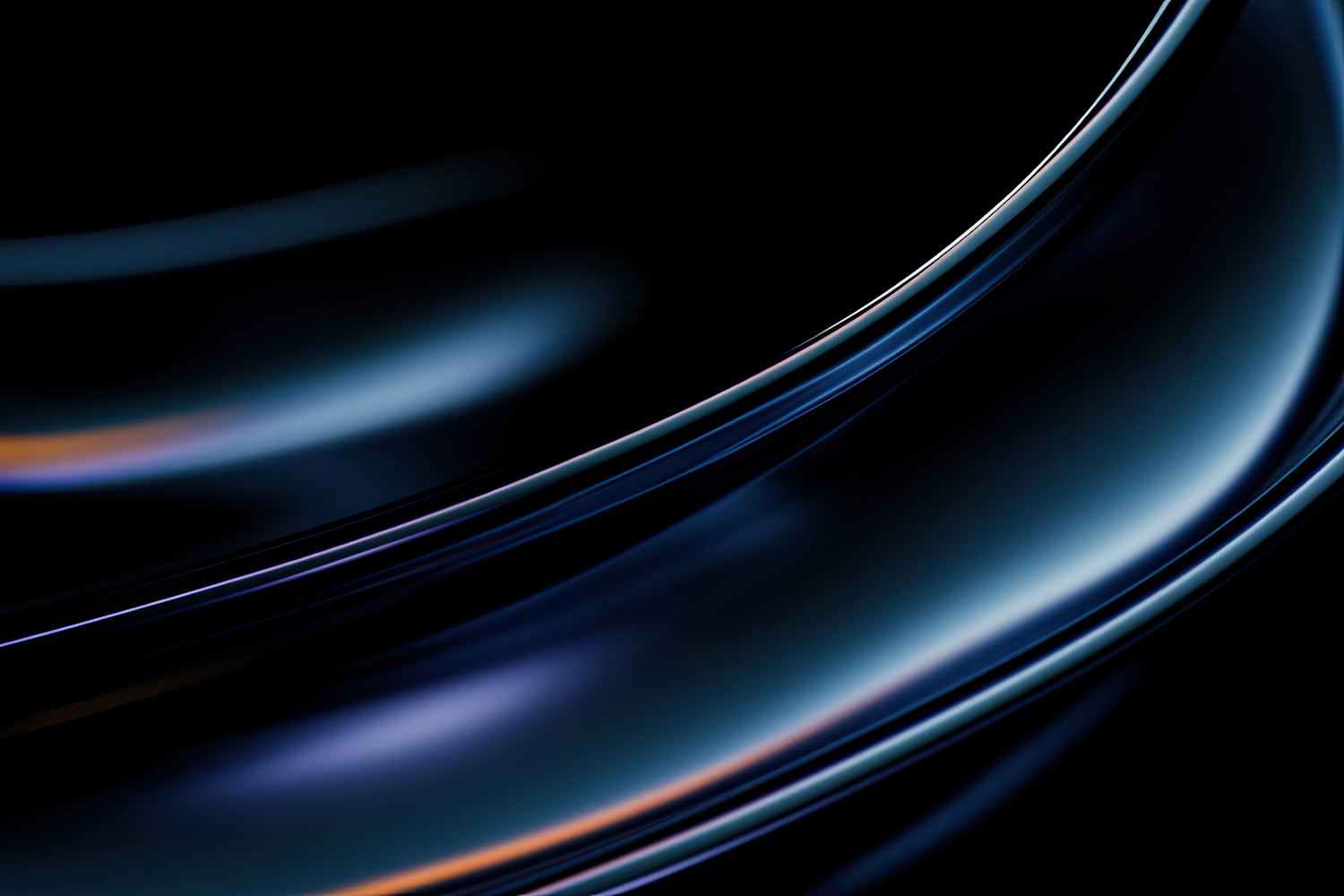 Abstract curves with metallic and glass-like textures in dark tones, accented by soft blue and orange highlights. Sleek and futuristic.