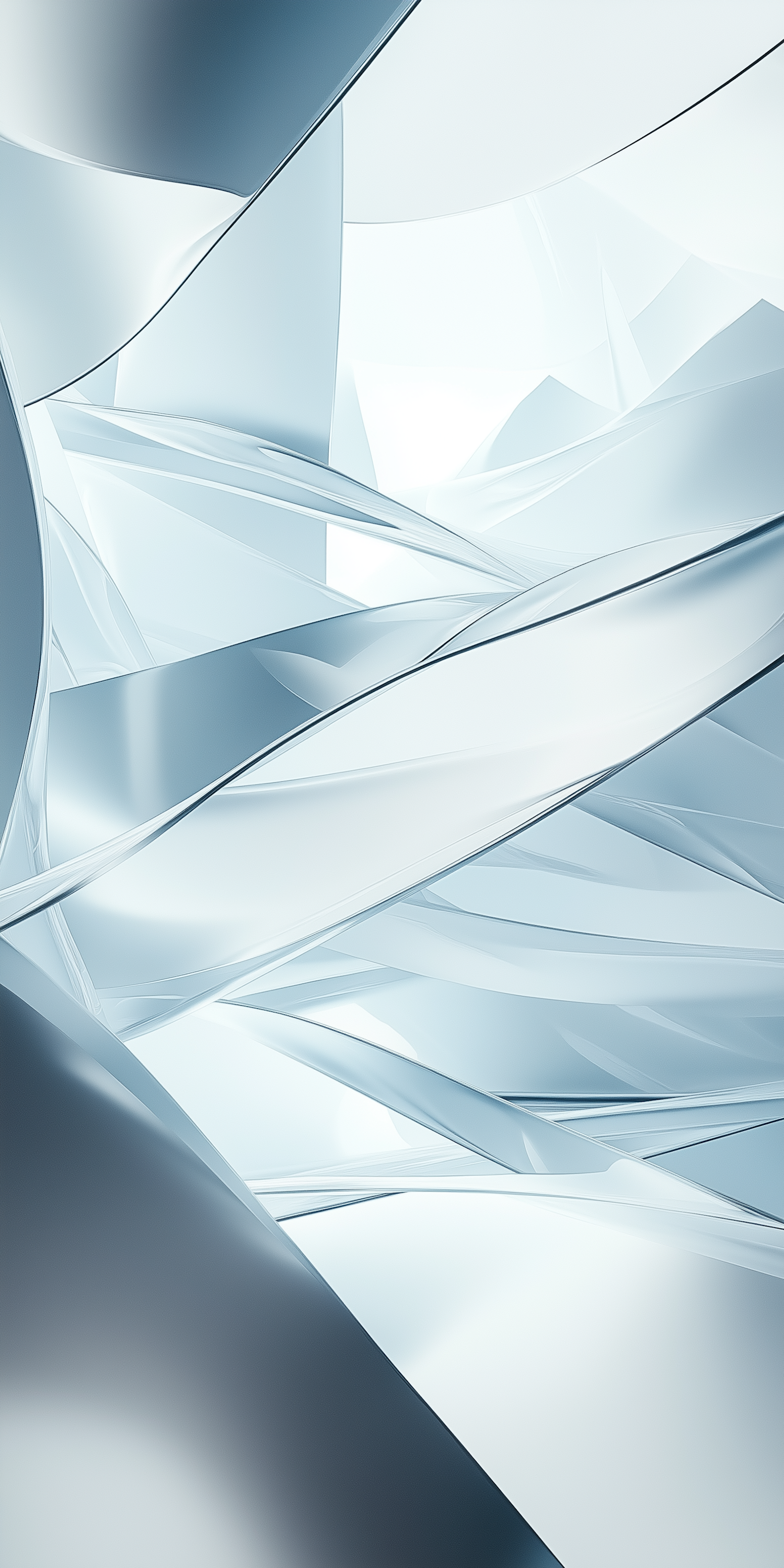 Abstract design with intertwining translucent shapes in white, silver, and blue tones, creating a sleek and futuristic aesthetic.