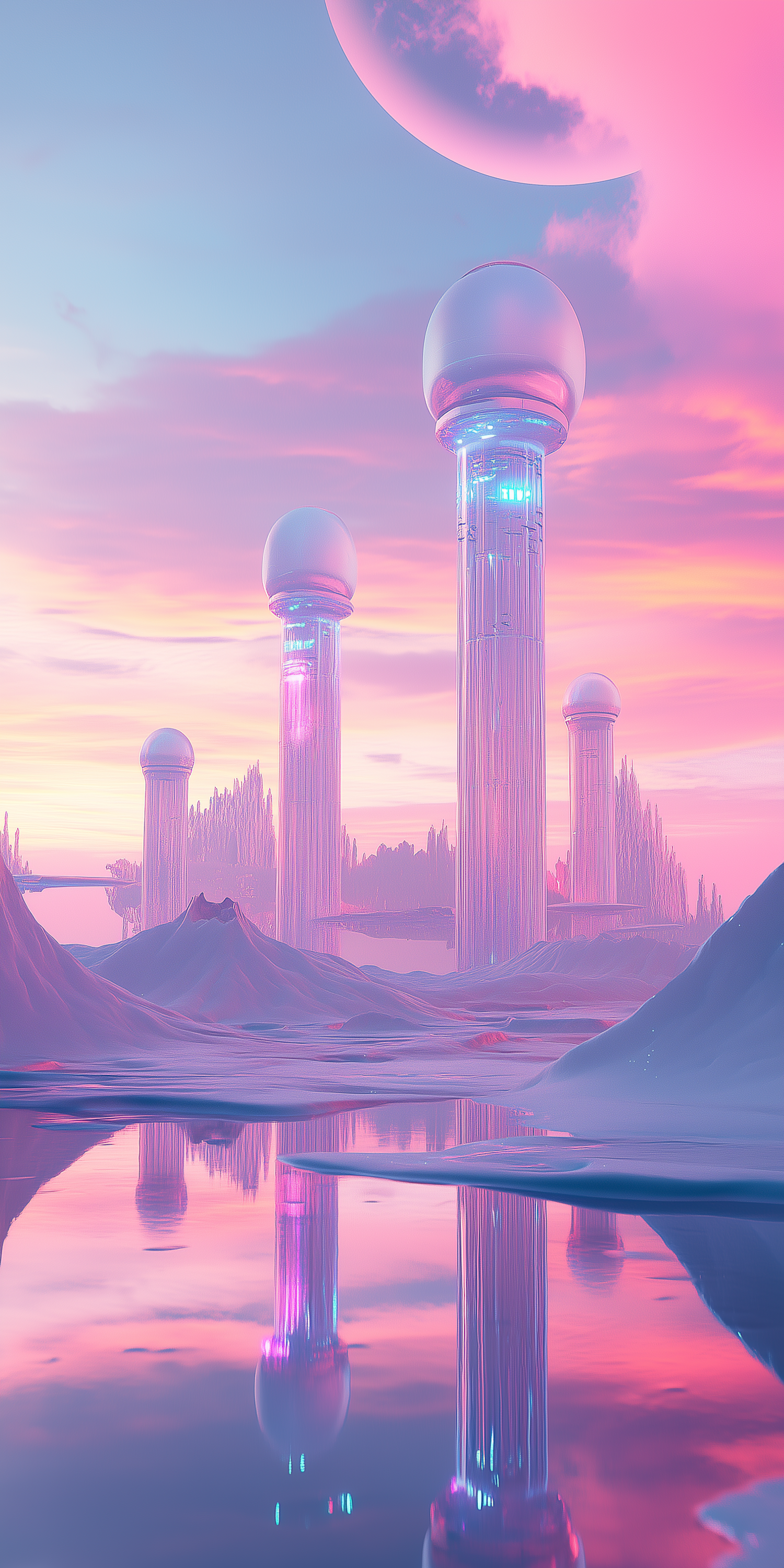 Futuristic glowing towers with domes in a pink and purple alien landscape, reflecting in a serene water body under a crescent-shaped celestial body.