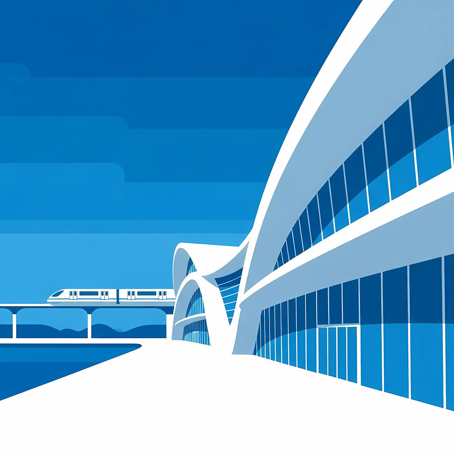 Futuristic illustration of a sleek building with curved architecture and a monorail train on an elevated track under a blue sky.