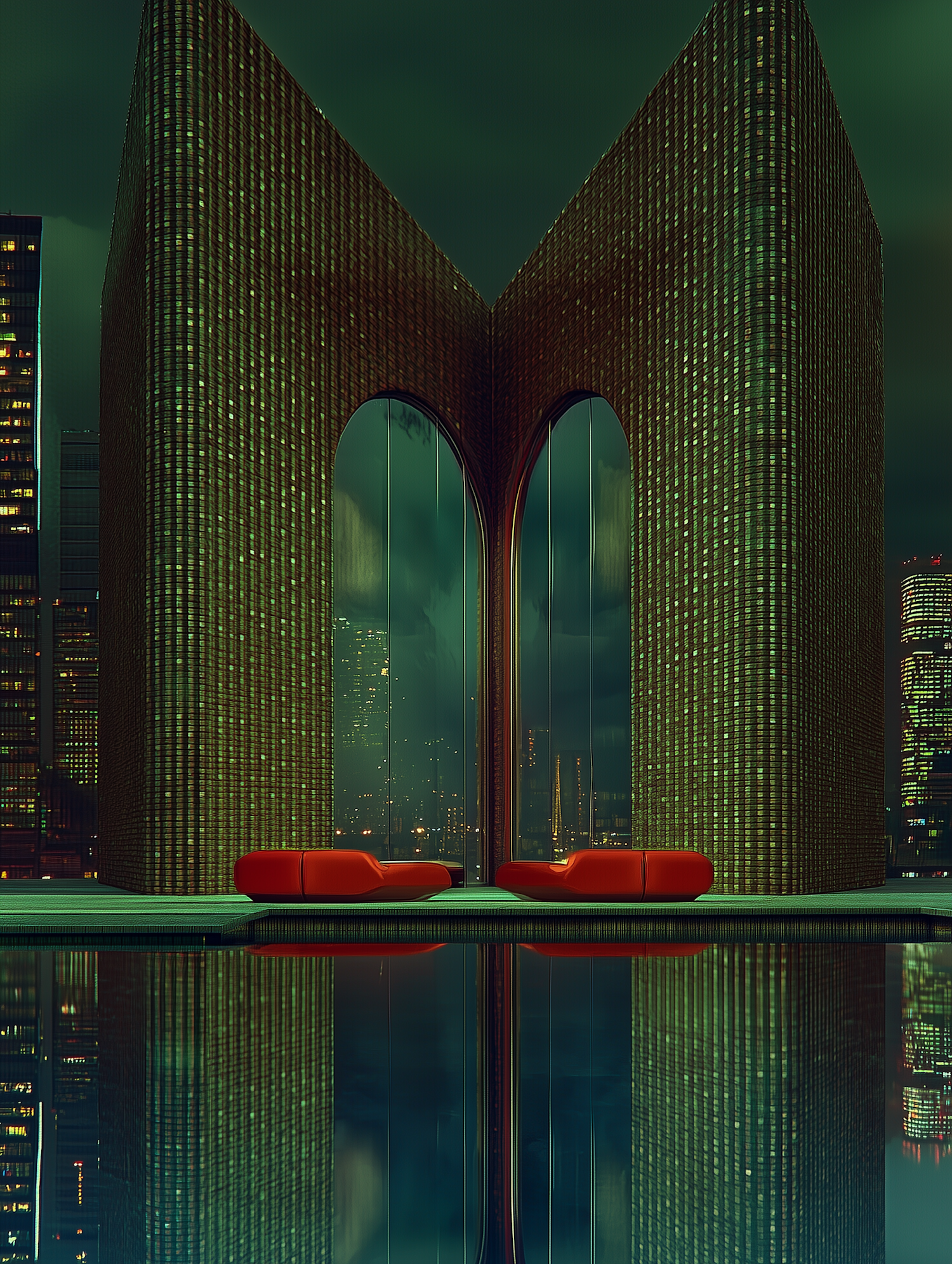 Futuristic arched building with glowing green windows, red lounge chairs, and a reflective water surface in a moody cityscape.