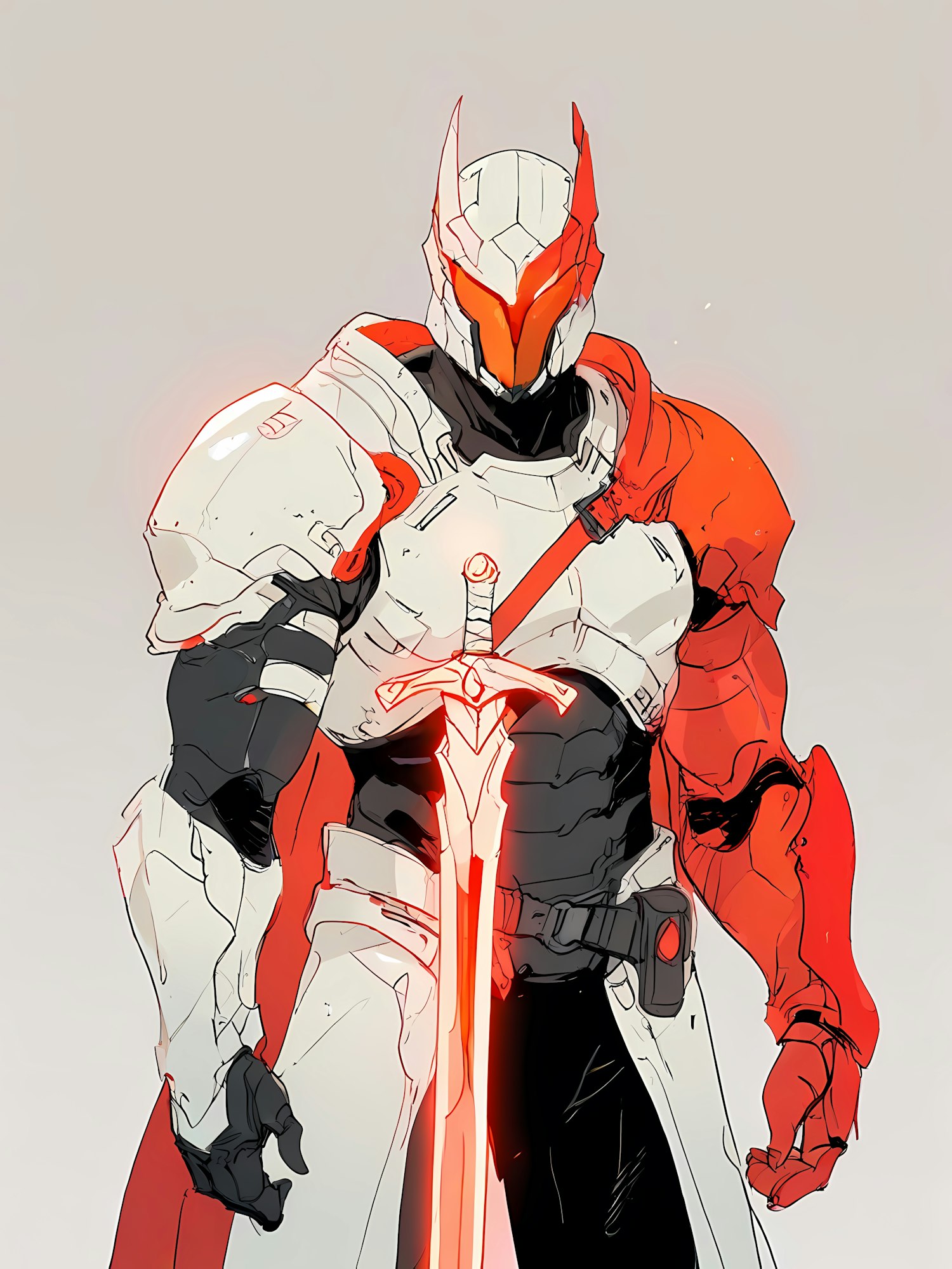Futuristic armored warrior in white and red, wielding a glowing red sword, with a sleek helmet and a dramatic cape.