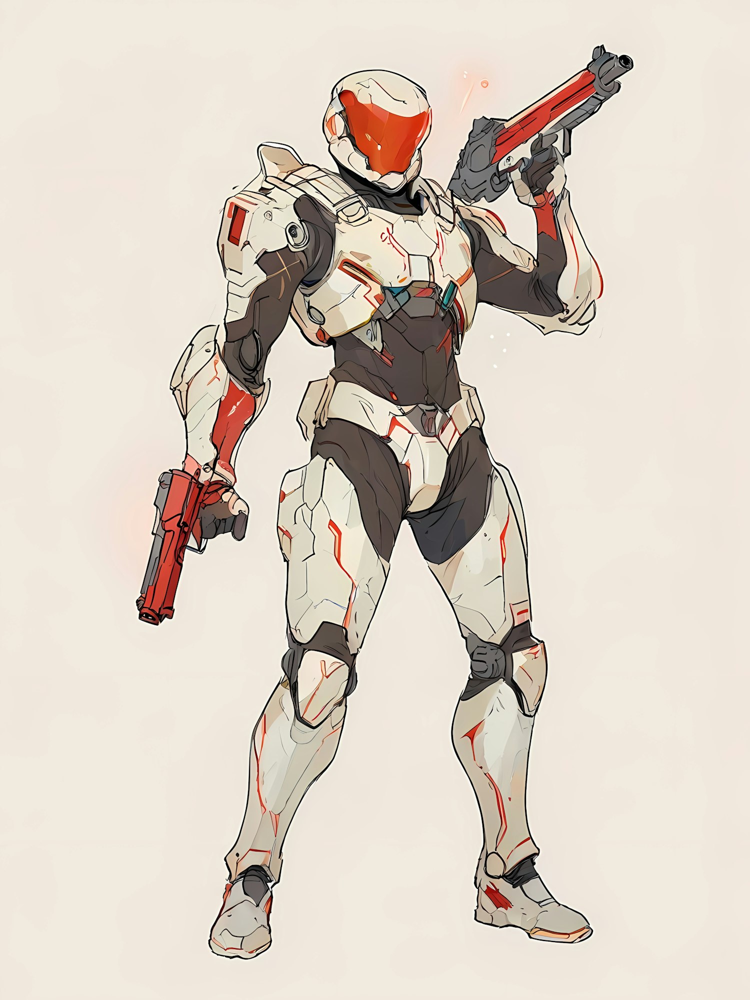 Futuristic soldier in white and red armor with dual weapons, featuring a sleek design and a reflective red visor.