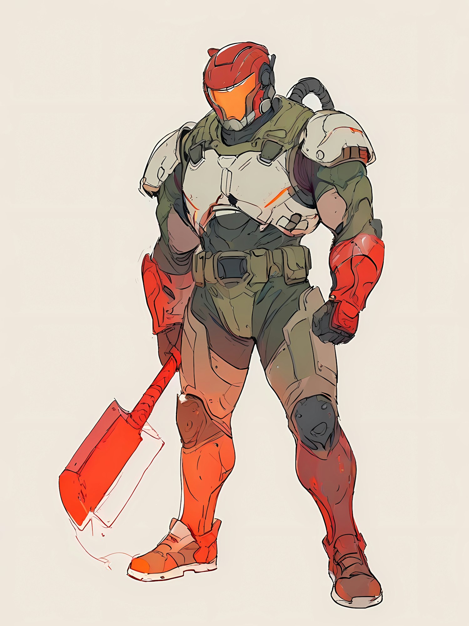 Futuristic armored warrior with red helmet and glowing hammer, showcasing advanced technology and strength in a sleek design.