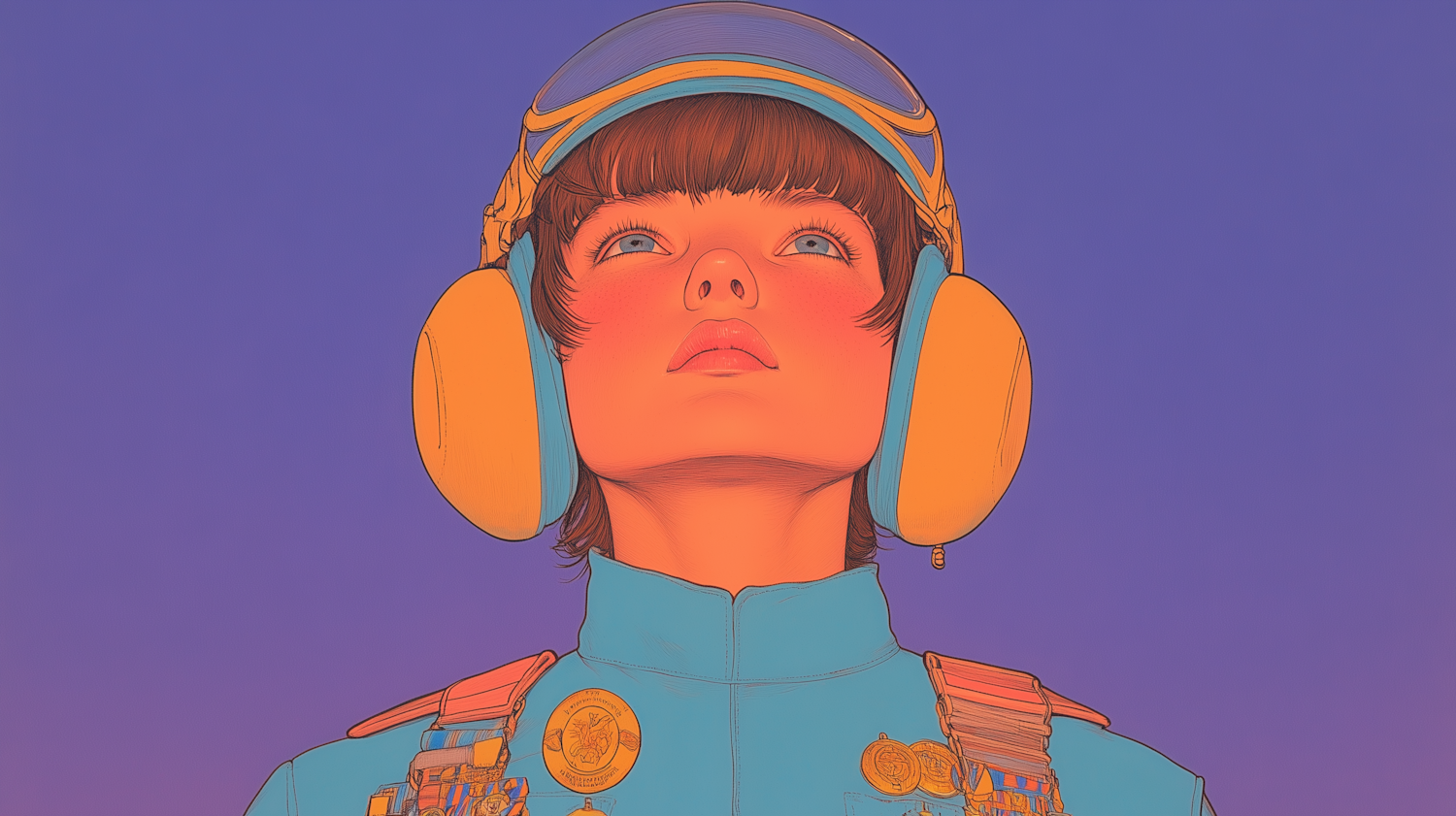 Futuristic illustration of a person with earmuffs and helmet, gazing upwards. Blue uniform with badges, set against a purple gradient background.