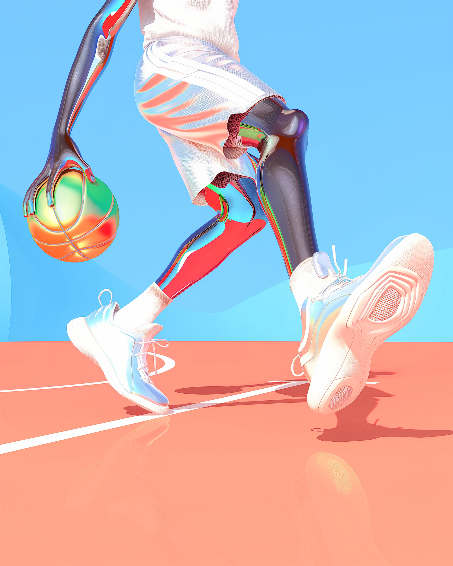 Futuristic basketball player with robotic limbs dribbling a colorful ball on a bright court under a clear blue sky.
