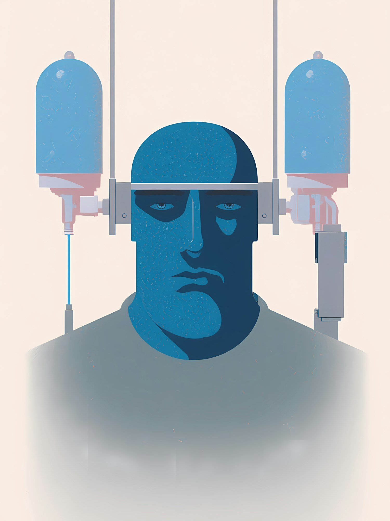 Stylized illustration of a blue-toned figure with futuristic headgear, set against a minimalistic beige background.