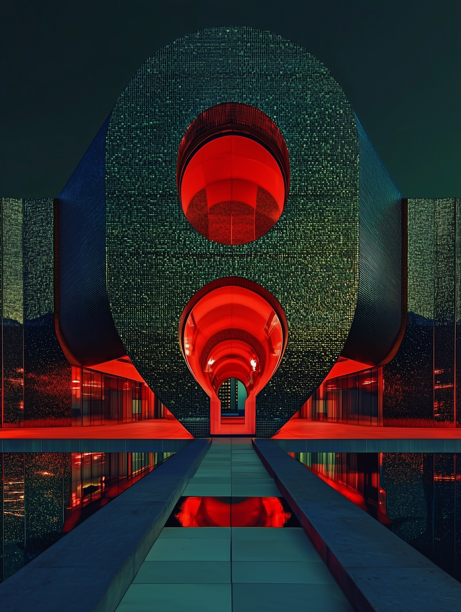 Futuristic building with glowing red interiors, circular design, and reflective water surfaces creating a surreal, symmetrical scene.