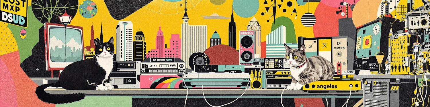 Cats lounging on abstract consoles in a vibrant, retro-futuristic cityscape create a playful and colorful artistic depiction.