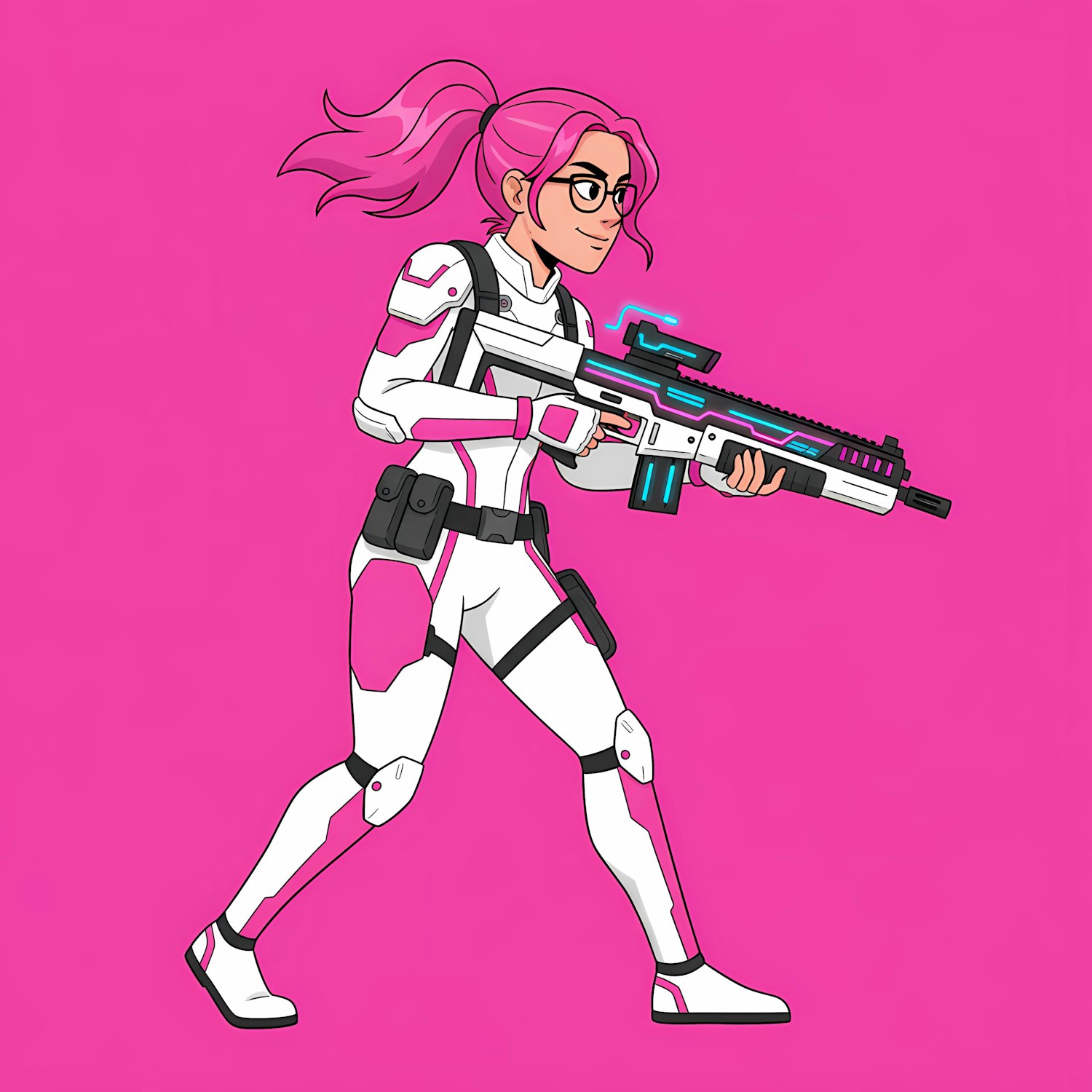 A dynamic illustration of a futuristic character in a white and pink suit holding a glowing weapon, set against a bold pink background.