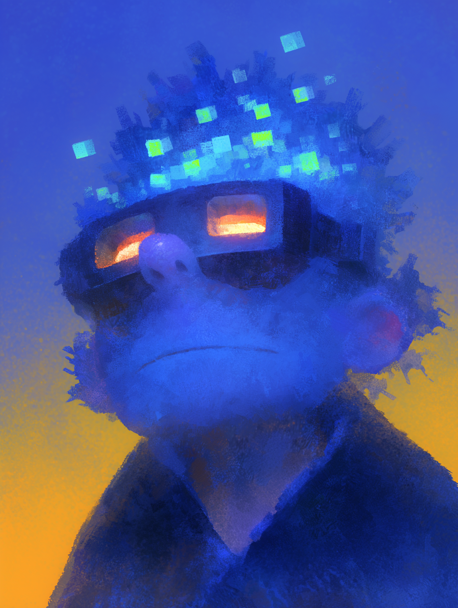 A vibrant illustration of a futuristic character with glowing glasses and pixelated hair, set against a blue-to-yellow gradient background.