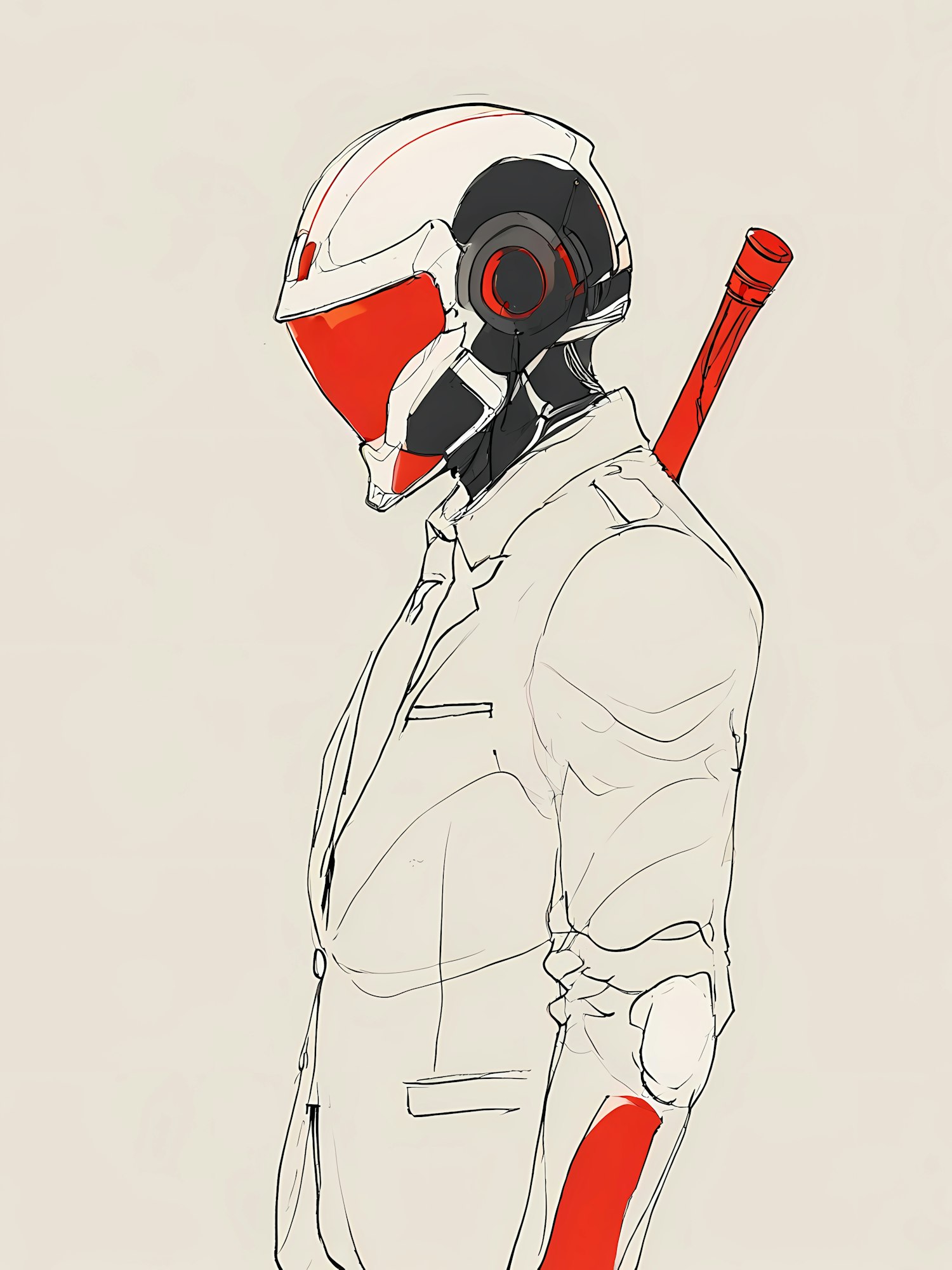 Futuristic character in a sleek helmet and suit with red accents, holding a baton. Modern and sci-fi elements blend seamlessly.