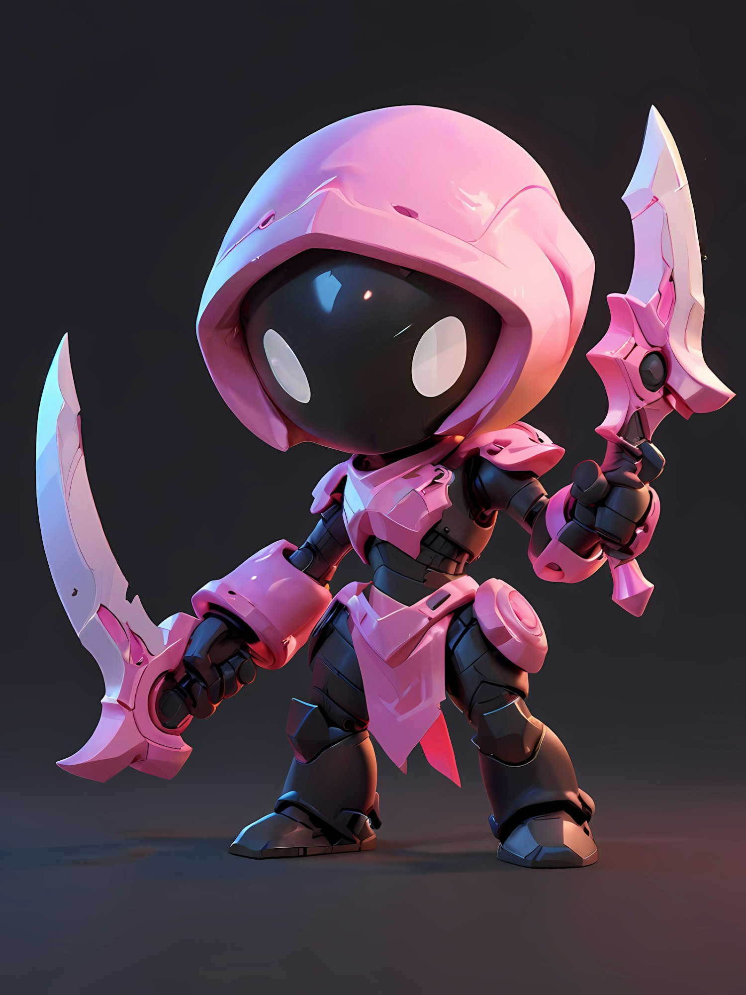 Adorable chibi-style robot warrior in pink armor with dual blades, glowing eyes, and a sleek futuristic design on a dark background.