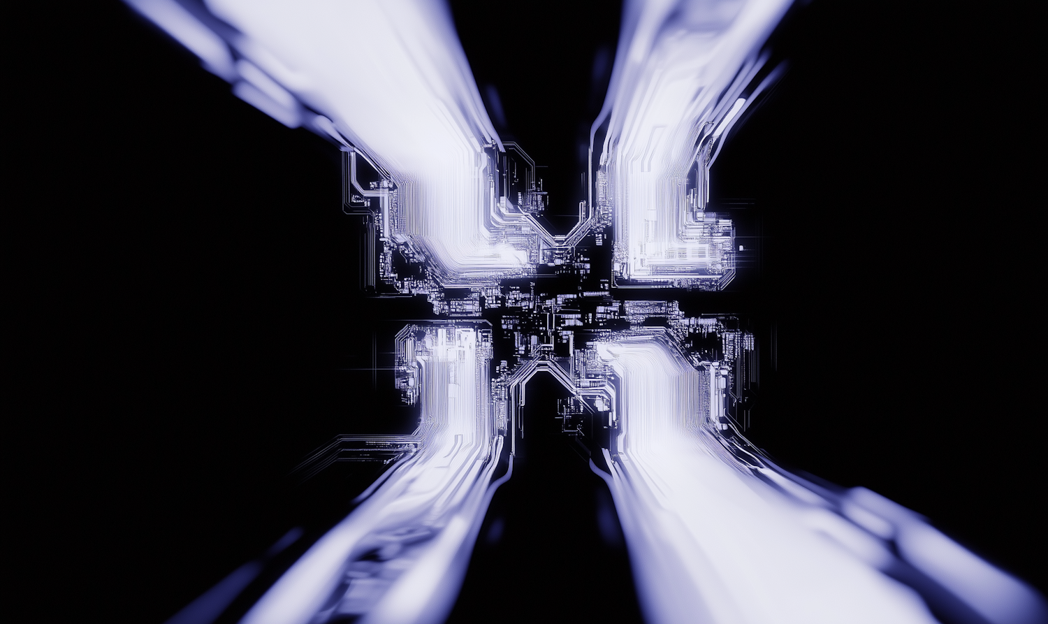 Futuristic glowing circuit board in an 'X' shape with bright white and blue light on a black background, symbolizing technology and innovation.